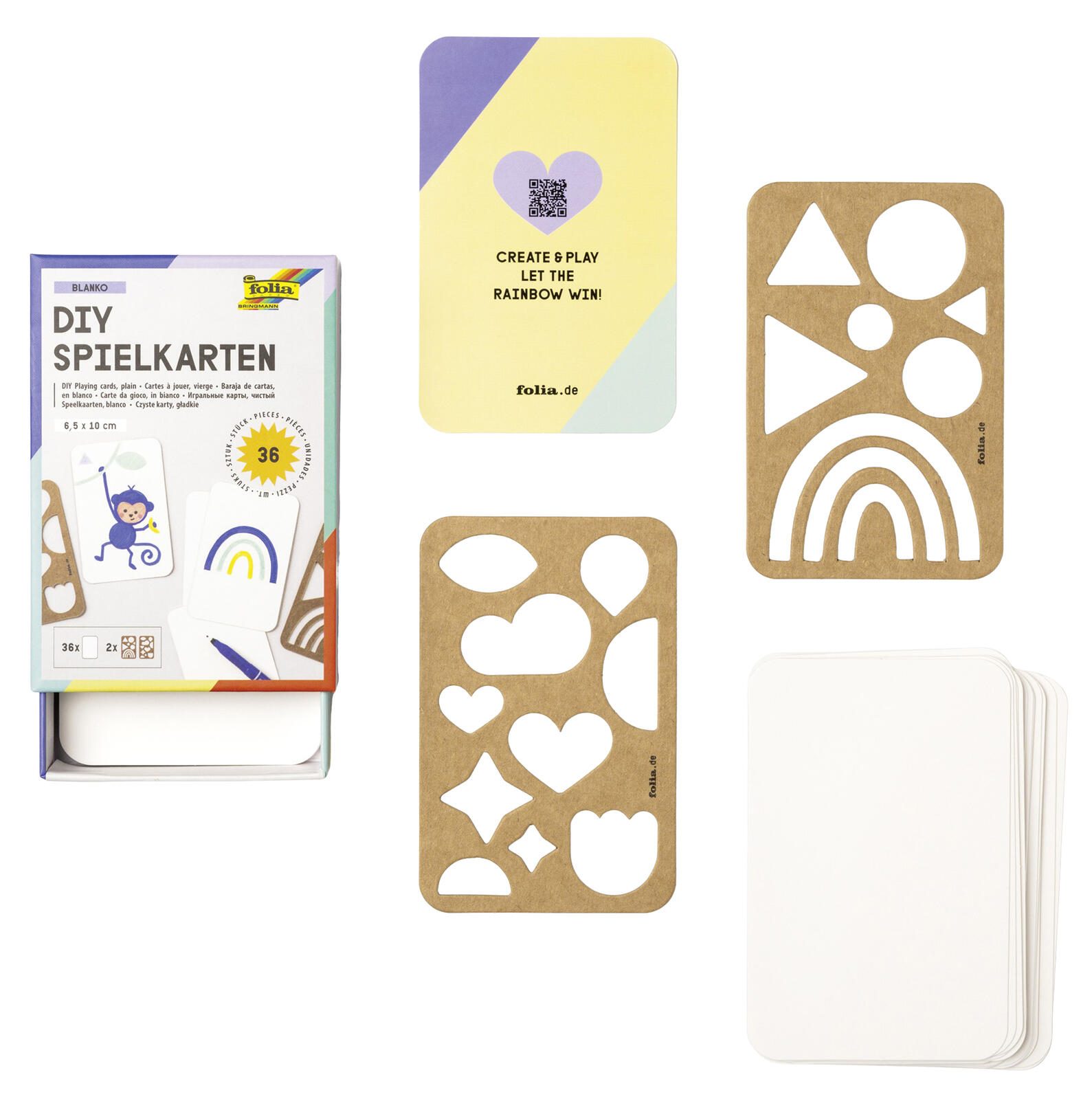 Zum einfachen Gestalten liegen dem Set zwei Schablonen bei, die Dir beim Bemalen helfen. Zusätzlich ist ein QR-Code enthalten, der zu einer Anleitung führt, die sowohl Tipps zum Bemalen als auch Vorschläge für verschiedene Spielideen bietet. Damit ist das Bastelset besonders gut für Einsteiger geeignet, die ohne großen Aufwand eigene Spielkarten herstellen möchten.