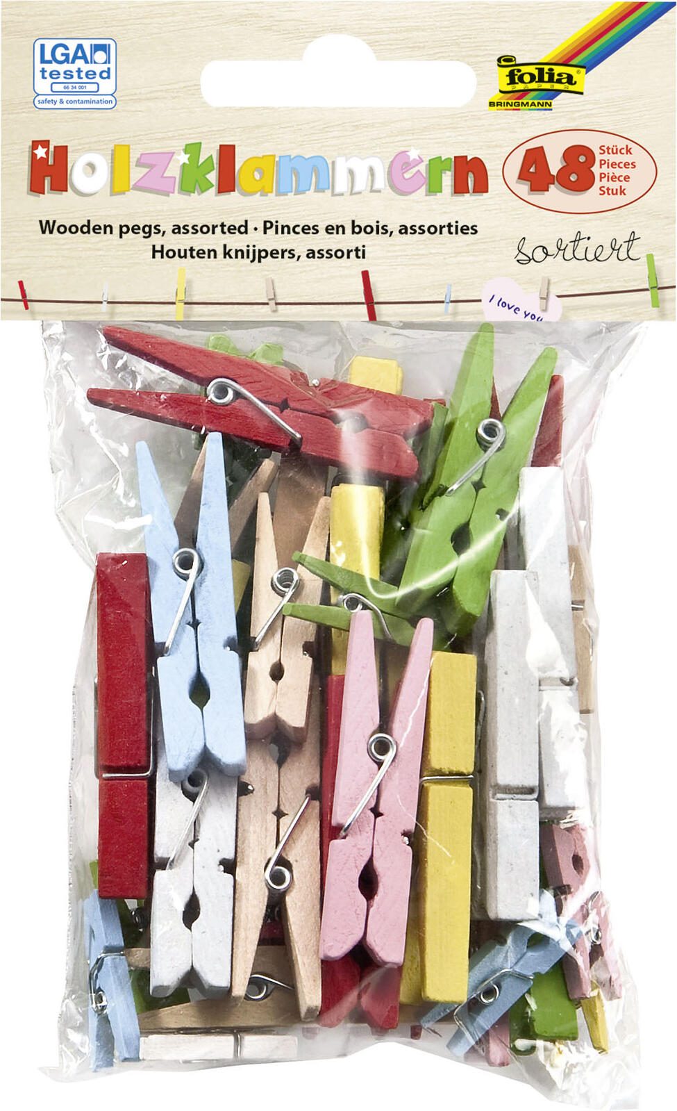 Die Holzklammern sind in den Größen 48x7mm (23 Stück), 35x7mm (3 Stück) und 25x3mm (22 Stück) erhältlich, was Ihnen eine Vielzahl von Möglichkeiten bietet, um unterschiedliche Materialien sicher zu fixieren. Ob zum Zusammenhalten von Papieren, zum Dekorieren von Geschenken oder für kreative Bastelideen – die folia Holzklammern sind vielseitig einsetzbar und bringen Farbe in Ihre Projekte.