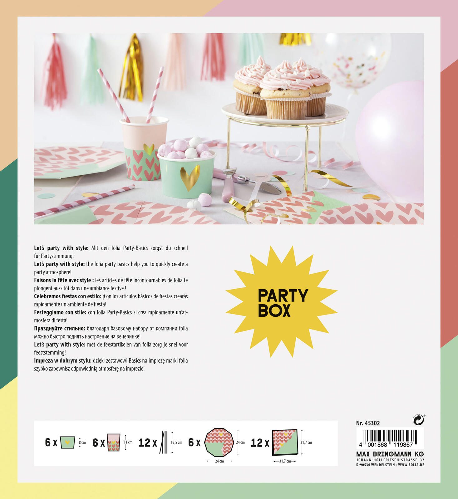 Das folia Herze Party-Set mehrfarbig ist die perfekte Wahl für festliche Anlässe, Geburtstagsfeiern und viele weitere Feierlichkeiten. Mit seinem ansprechenden und bunten Design bringt dieses Einweg-Geschirrset eine fröhliche Atmosphäre in jede Veranstaltung. Die mehrfarbigen Elemente des Sets sorgen dafür, dass jeder Tisch einladend und lebhaft aussieht, was besonders wichtig ist, wenn du deine Gäste beeindrucken möchtest. Hergestellt aus hochwertiger Pappe, bietet das folia Herze Party-Set nicht nur eine ansprechende Optik, sondern auch eine praktische Lösung für die Bewirtung deiner Gäste. Da es sich um ein Einweg-Geschirrset handelt, sparst du dir die mühsame Reinigung nach der Feier und kannst mehr Zeit mit deinen Freunden und deiner Familie verbringen. Das Material ist robust genug, um auch bei etwas herzhaften Snacks standzuhalten, sodass du dir keine Sorgen um die Stabilität machen musst. Die farbenfrohe Gestaltung des Sets macht es besonders geeignet für Mädchengeburtstage und andere Feiern, bei denen eine fröhliche und lebendige Stimmung gewünscht ist. Das folia Herze Party-Set ist nicht nur funktional, sondern auch ein echter Blickfang, der das Gesamtbild deiner Feier aufwertet. Egal ob du eine kleine Zusammenkunft oder eine große Feier planst, dieses Set wird sicherlich dazu beitragen, dass der Anlass unvergesslich wird. Mit dem folia Herze Party-Set mehrfarbig entscheidest du dich für eine unkomplizierte und stilvolle Lösung, die sowohl praktisch als auch optisch ansprechend ist. Lass deine Feier mit diesem einzigartigen Geschirrset erstrahlen und genieße die unbeschwerte Zeit mit deinen Lieben.Technische Daten