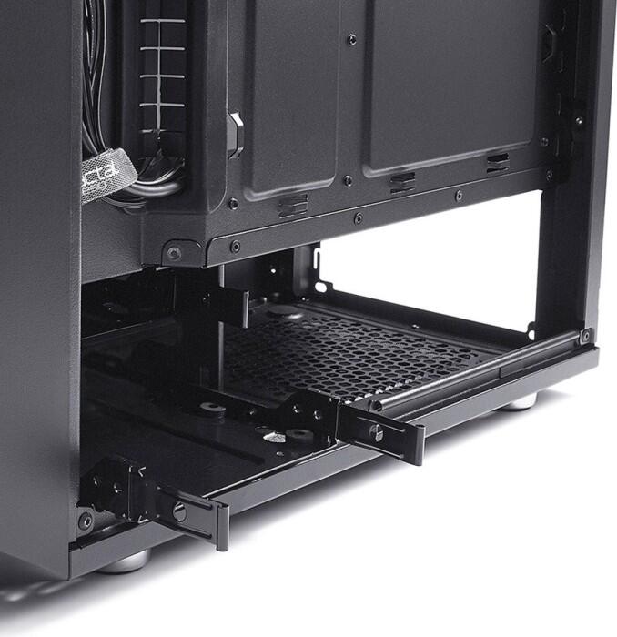 Raum zur Entfaltung- Einbau von bis zu fünf Laufwerken möglich - Die durchgängige PSU-Abdeckung verbirgt den Laufwerkskäfig und überschüssige Kabel für einen perfekten Airflow und einen aufgeräumten Innenraum - Der Mainboardträger mit gummierten Kabeldurchführungen bietet auf der Rückseite bis zu 35mm Platz für Kabelmanagement - Drei dedizierte SSD Positionen