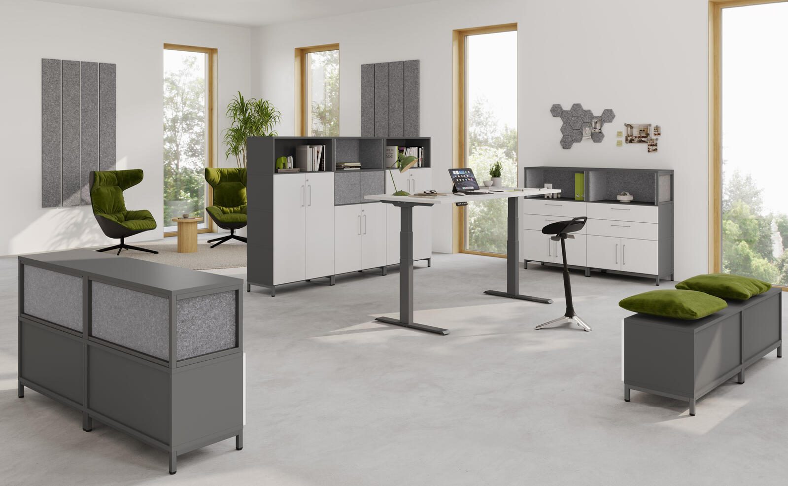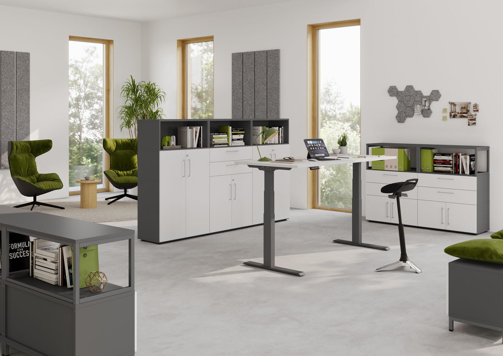 Das HAMMERBACHER FW Regal 2OH, 1OH offen in grafit bietet eine ideale Lösung für alle, die Funktionalität und modernes Design schätzen. Mit seinem eleganten Farbton in grafit fügt sich das Regal harmonisch in jede Umgebung ein und sorgt für einen stilvollen Akzent in deinem Raum. Dieses Aktenregal überzeugt durch seine durchdachte Konstruktion und die Verwendung hochwertiger Materialien wie Spanplatte und Stahl. Die Kombination dieser Materialien gewährleistet nicht nur Stabilität, sondern auch eine ansprechende Optik. Die Maße von 80,0 x 40,0 x 74,6 cm machen es zu einem kompakten Möbelstück, das sich sowohl im Büro als auch im Wohnbereich perfekt integrieren lässt. Ein herausragendes Merkmal des HAMMERBACHER FW Regals ist das obere Fach mit offenem Rahmenelement, das dir ermöglicht, wichtige Dokumente oder dekorative Elemente stilvoll zu präsentieren. Die werkzeuglose Korpusmontage und die einfache Demontage durch ein praktisches Klicksystem ermöglichen es dir, das Regal in Sekundenschnelle zusammenzubauen oder bei Bedarf zu transportieren. Die vier höhenjustierbaren Stellfüße bieten zusätzliche Flexibilität und sorgen dafür, dass das Regal auch auf unebenen Böden stabil steht. Dies ist besonders vorteilhaft, wenn du das Regal in verschiedenen Räumen oder an unterschiedlichen Orten nutzen möchtest. Mit dem HAMMERBACHER FW Regal 2OH, 1OH offen in grafit erhältst du nicht nur ein funktionales Möbelstück, sondern auch einen stilvollen Blickfang, der deinem Raum eine moderne Note verleiht.Technische Daten