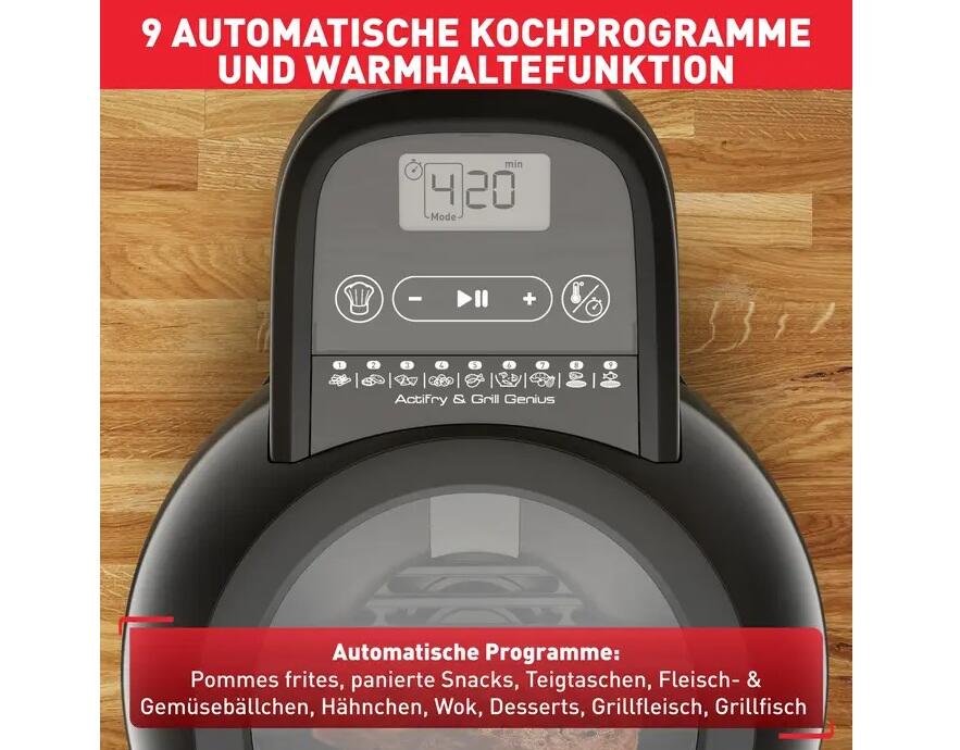 Wie wäre es, wenn tägliches Zubereiten von gesundem, knusprigem und gegrilltem Essen ein Kinderspiel wäre? Dank des patentierten Rührarms rührt ActiFry & Grill Genius automatisch für Sie um und sorgt so für müheloses Kochen und perfekt gleichmäßige Ergebnisse. Das in Frankreich hergestellte Produkt kombiniert eine Grillfunktion zum Anbraten aller Arten von Lebensmitteln mit der Technologie einer Heißluftfritteuse, um mit wenig oder gar keinem Öl zu kochen. Mit 9 automatischen Programmen und einem digitalen Rezeptbuch zur Inspiration war Kochen noch nie so einfach und abwechslungsreich.