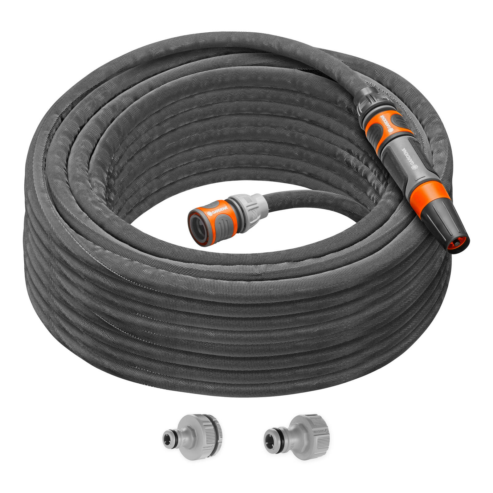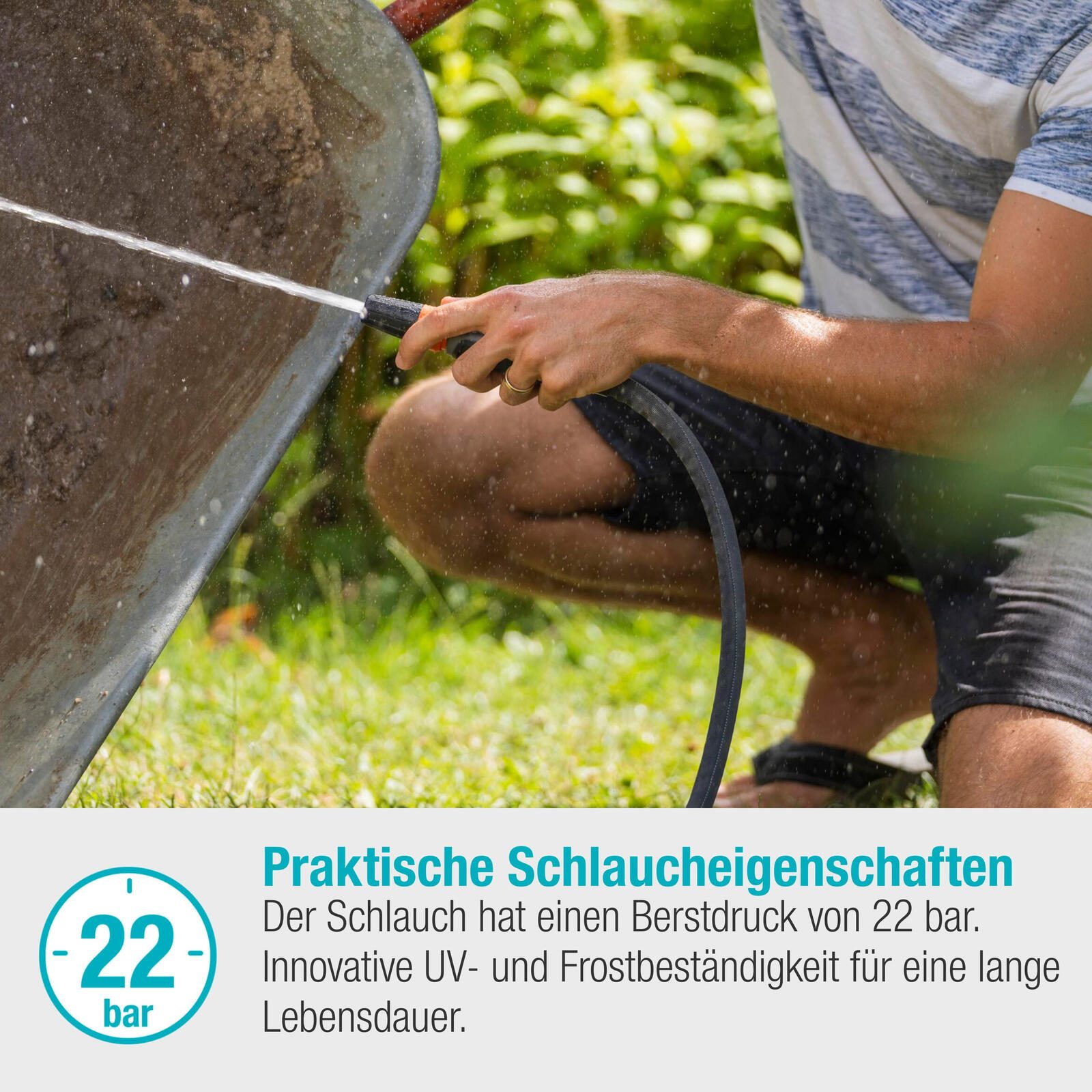 Der GARDENA Gartenschlauch Life 1/2" Set ist die perfekte Lösung für alle Gartenliebhaber, die Wert auf Qualität und Funktionalität legen. Mit einer Länge von 20 Metern bietet dieser Schlauch ausreichend Reichweite für die Bewässerung deiner Pflanzen und Blumenbeete. Das hochwertige Textilgewebe sorgt nicht nur für eine hohe Flexibilität, sondern auch für eine lange Lebensdauer, sodass du lange Freude an diesem Produkt haben wirst. Das Set kommt komplett mit Original GARDENA Systemteilen, einschließlich einer praktischen Reinigungsspritze und Hahnverbindern (18225/18220), die eine einfache und schnelle Verbindung zu deinem Wasserhahn ermöglichen. Die schwarze Farbe des Schlauches verleiht deinem Garten ein modernes und elegantes Aussehen, während die robuste Materialbeschaffenheit dafür sorgt, dass der Schlauch auch bei intensiver Nutzung nicht knickt oder bricht. Die GARDENA Qualität steht für Zuverlässigkeit und Benutzerfreundlichkeit. Mit diesem Gartenschlauch kannst du deine Gartenarbeit effizienter gestalten, da er leicht zu handhaben ist und sich ideal für verschiedene Anwendungen eignet, sei es zum Gießen, Spritzen oder Reinigen. Die Kombination aus Funktionalität und ansprechendem Design macht den GARDENA Gartenschlauch Life 1/2" Set zu einem unverzichtbaren Werkzeug für jeden Gartenfreund. Entdecke die Vorteile eines Gartenschlauchs, der nicht nur leistungsstark, sondern auch optisch ansprechend ist. Mit dem GARDENA Gartenschlauch Life 1/2" Set bringst du frisches Leben in deinen Garten und sorgst dafür, dass deine Pflanzen stets optimal versorgt werden.Weiterlesen
