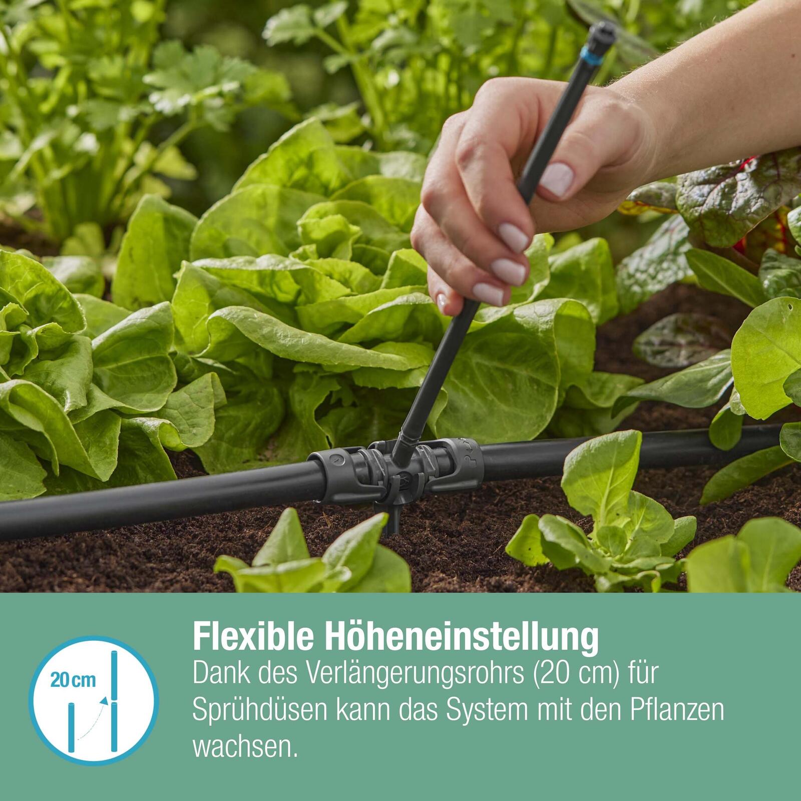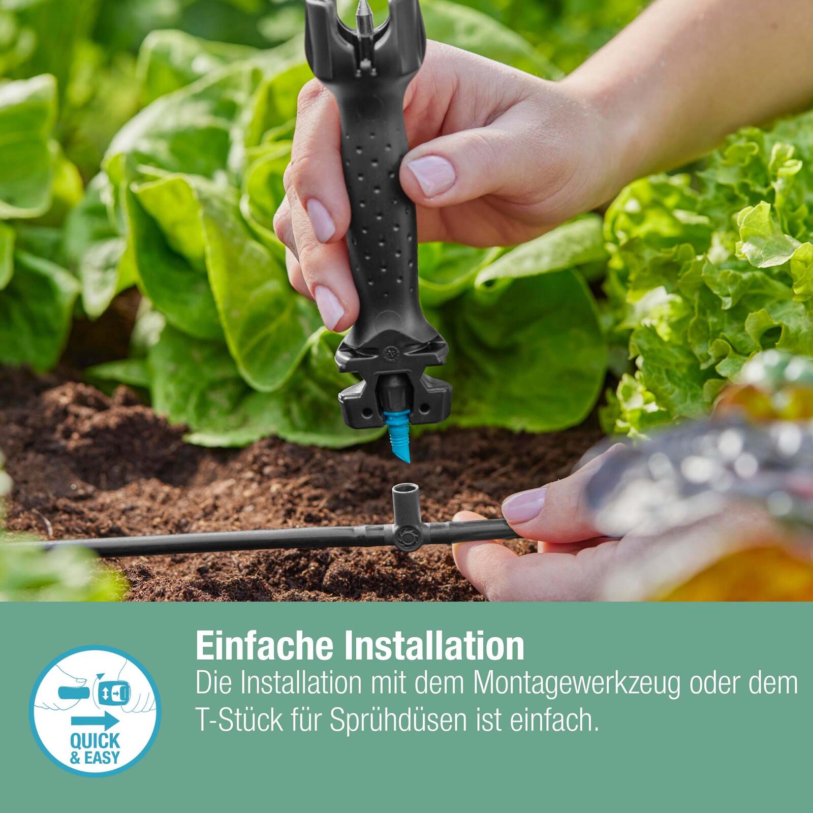 Hergestellt aus strapazierfähigem Kunststoff in den Farben Schwarz und Orange, fügt sich die Düse harmonisch in dein Gartendesign ein. Durch die Kompatibilität mit dem Verlegerohr Flex 13 mm (1/2") (Art.-Nr. 1347/1346) oder dem T-Stück für Sprühdüsen (Art.-Nr. 13206/13216) und dem einfachen Einbau mit dem Montagewerkzeug (Art.-Nr. 13313) ist die Installation mühelos.