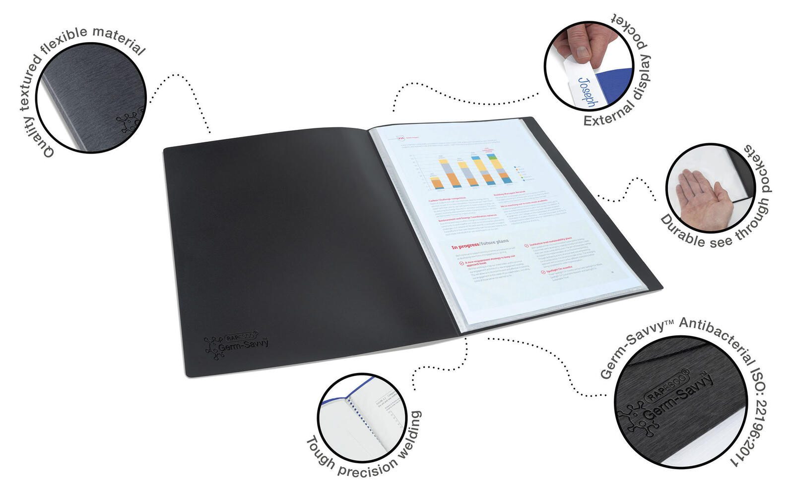 Das RAPESCO® Sichtbuch Germ-Savvy bietet nicht nur die optimale Lösung zur sicheren Aufbewahrung deiner Dokumente im DIN A4 Format, sondern überzeugt auch mit speziellen antibakteriellen Eigenschaften. Dank des Materials aus hochwertigem Polypropylen (PP) mit genarbter Oberfläche und einer schwarzen Farbe ist dieses Sichtbuch nicht nur ästhetisch ansprechend, sondern schützt deine Unterlagen effektiv vor äußeren Einflüssen.