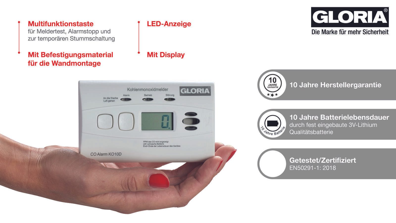 Der GLORIA Kohlenmonoxidmelder wird Ihnen inklusive Batterie und Montagematerial geliefert. Dieses Gerät besticht durch seine besonderen Eigenschaften, wie den Ereignisspeicher und die 3 LED-Anzeigen, die dir zuverlässig den Status des Melders anzeigen: grün für Betriebsbereitschaft, rot für Alarmzustand und gelb für Störung.