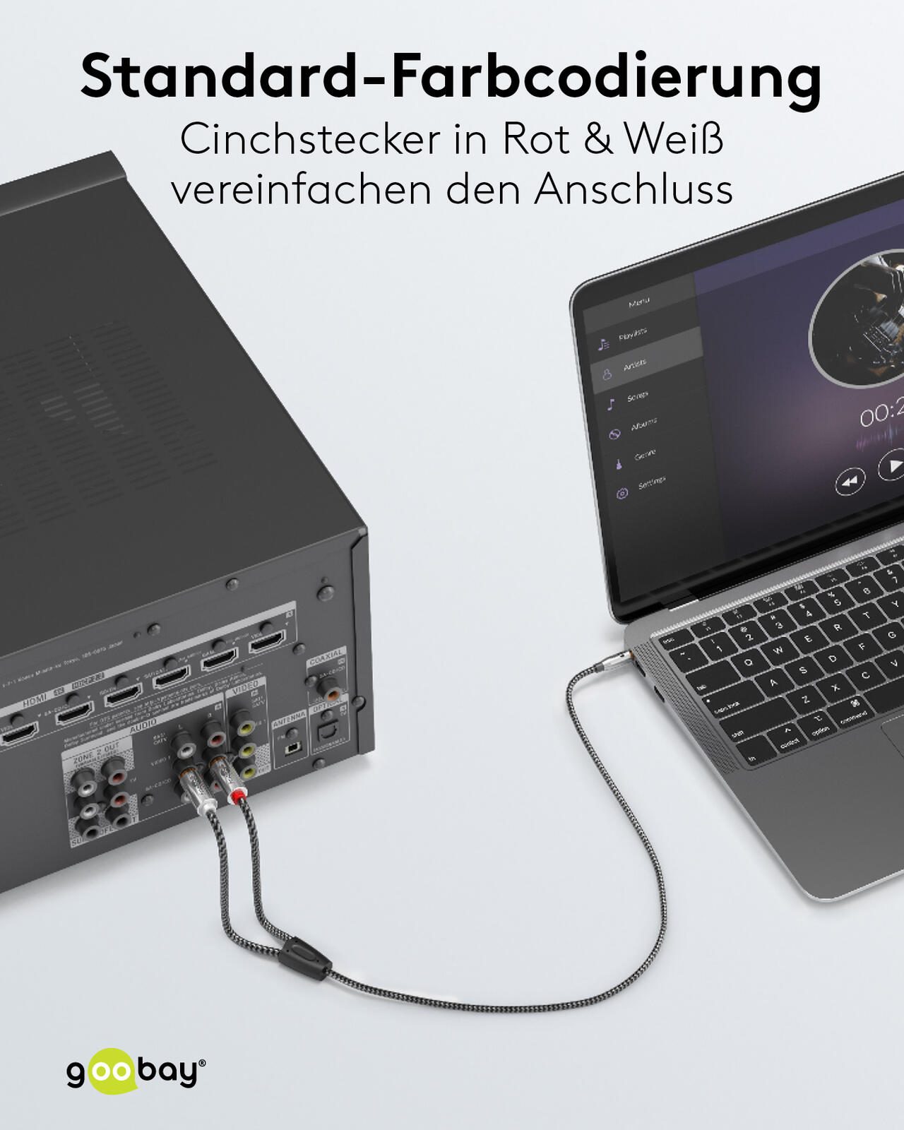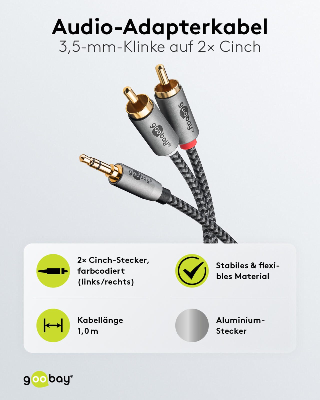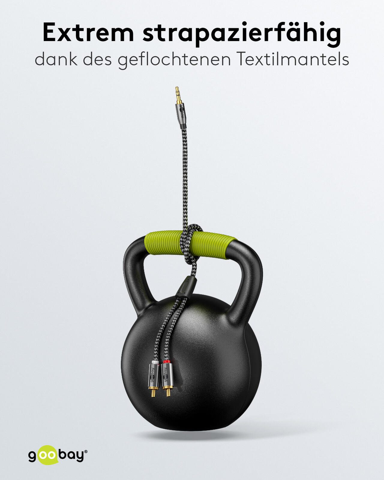 Das Kabel ist als Adapterkabel klassifiziert und eignet sich besonders zum Übertragen von Audiosignalen zwischen Geräten mit unterschiedlichen Anschlussarten. Die robuste Verarbeitung und die standardisierte Länge von 1,0 Meter bieten eine praktische Lösung für den Anschluss ohne überflüssige Kabellänge. Hersteller des Produkts ist die Marke goobay, vertreten durch die Wentronic GmbH mit Sitz in Braunschweig, Deutschland.