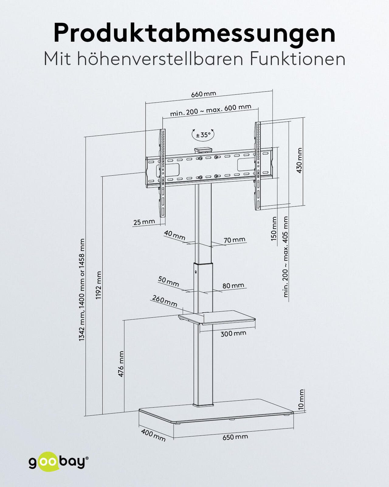 Mit Abmessungen von 66,0 x 40,0 x maximal 145,8 cm ist der goobay TV-Ständer Basic für die meisten Fernsehgeräte aller gängigen Marken geeignet. Dies macht ihn zu einer vielseitigen Wahl, egal ob Sie einen kleinen Fernseher oder ein großes Modell besitzen. Die durchdachte Konstruktion ermöglicht eine einfache Montage und sorgt dafür, dass Ihr Fernseher sicher und fest steht, während Sie Ihre Lieblingssendungen genießen.