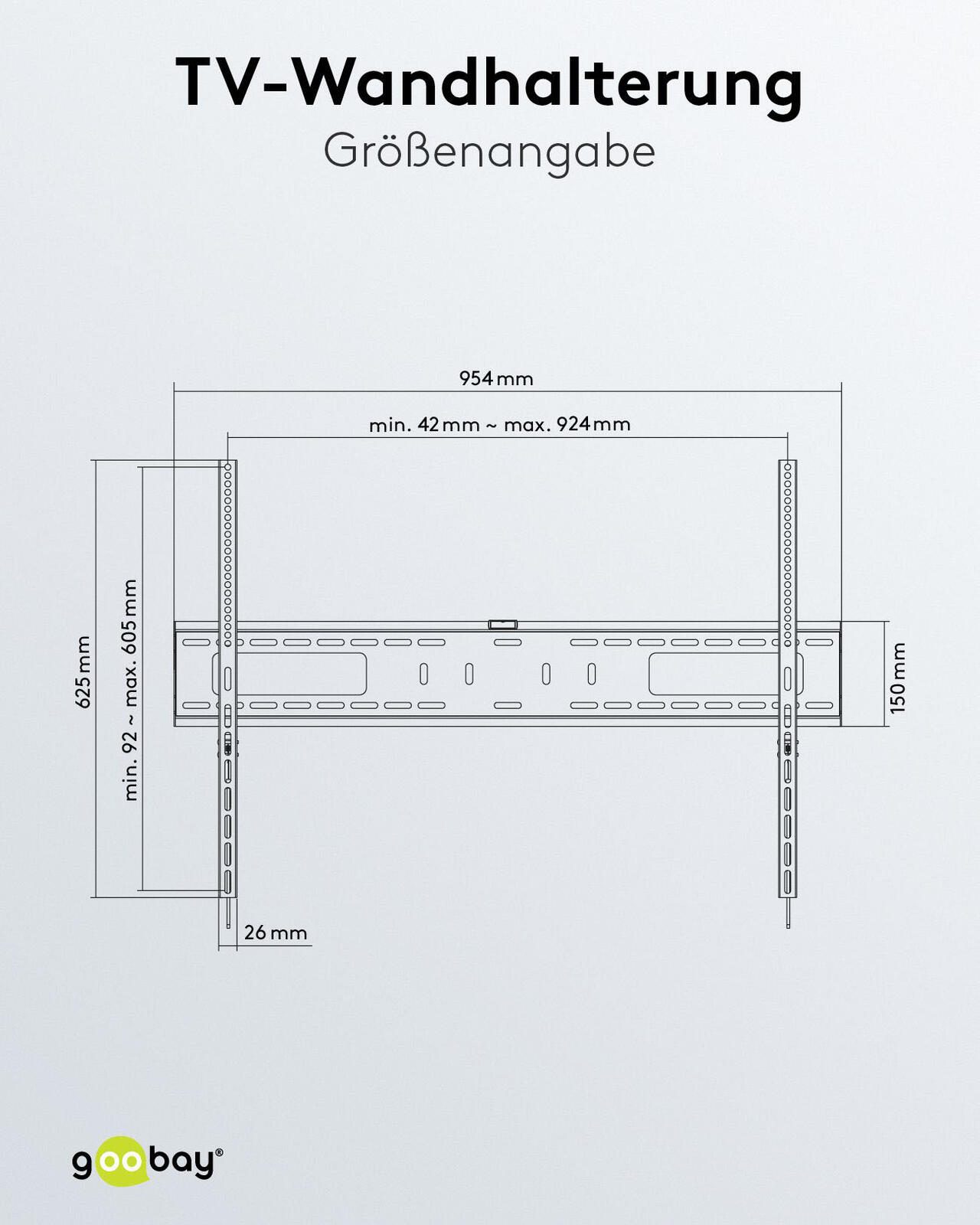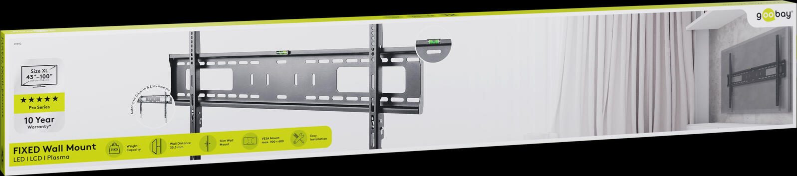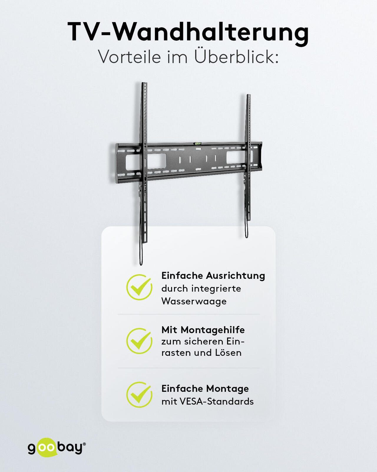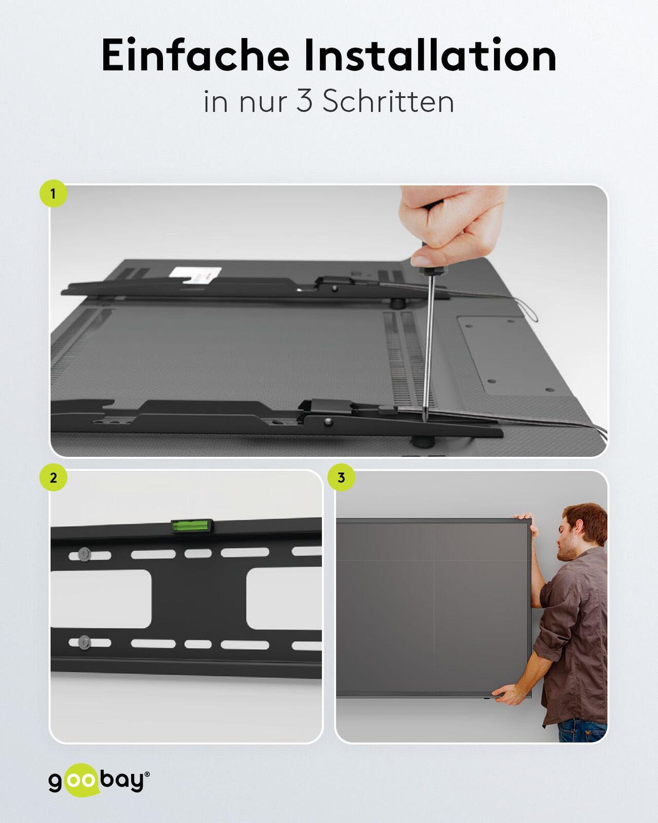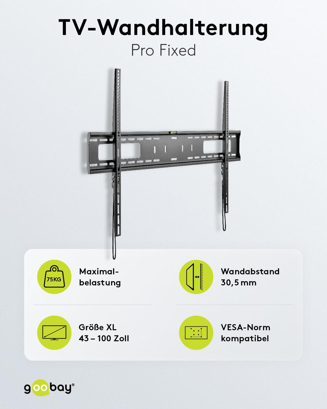 Die Goobay TV-Wandhalterung ProFIXED ist die ideale Lösung, um deinen Flach- oder Curved-Fernseher sicher und stilvoll an der Wand zu befestigen. Dank ihres zeitlosen Designs in elegantem Schwarz fügt sie sich nahtlos in jedes Wohnambiente ein.