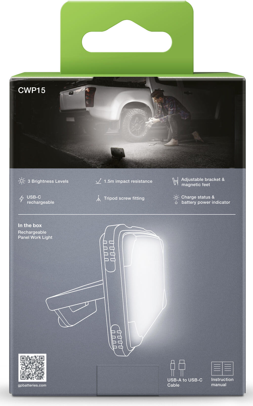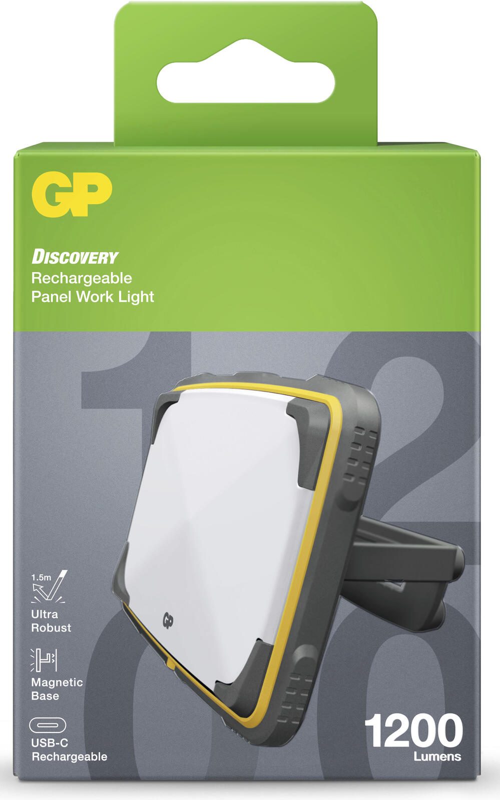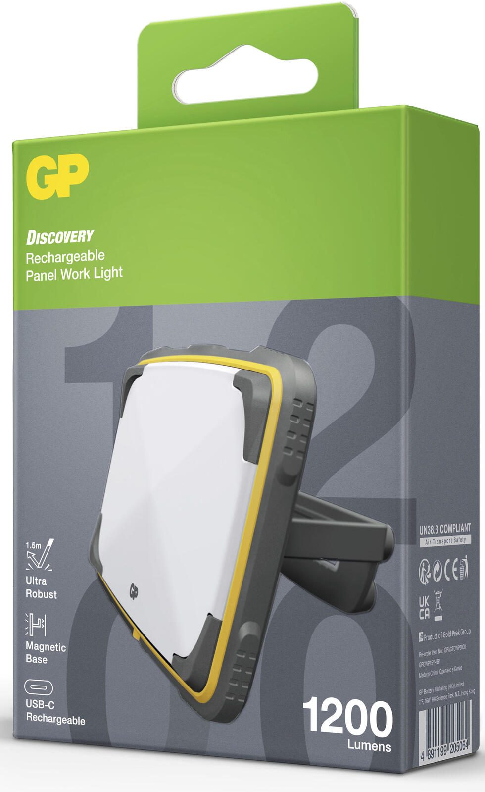 Das robuste Gehäuse der GP LED-Arbeitsleuchte Panel besteht aus hochwertigem Kunststoff in Grau, was nicht nur für eine moderne Optik sorgt, sondern auch für Langlebigkeit und Sicherheit bei der Verwendung im Freien.
