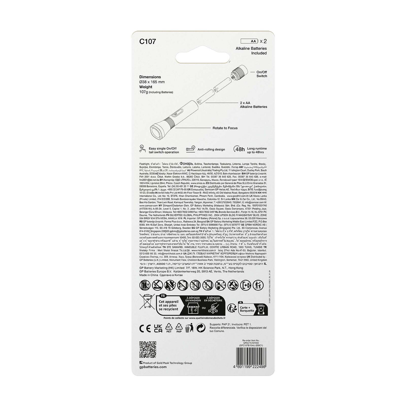 Die GP LED Taschenlampe C107 ist der ideale Begleiter für alle, die Wert auf zuverlässige Beleuchtung legen. Mit ihrem robusten Design und der hochwertigen LED-Technologie bietet sie nicht nur eine beeindruckende Lichtleistung, sondern auch eine bemerkenswerte Widerstandsfähigkeit. Diese Taschenlampe ist aus strapazierfähigem Kunststoff gefertigt und überzeugt durch ihre 1 Meter Stoß- und Schockfestigkeit, was sie perfekt für den Einsatz in anspruchsvollen Umgebungen macht. In elegantem Schwarz gehalten, fügt sich die GP LED Taschenlampe C107 nahtlos in jede Umgebung ein. Egal, ob du sie beim Camping, Wandern oder in Notfällen benötigst, sie ist stets bereit, dir den Weg zu erleuchten. Die Verwendung von LED-Technologie gewährleistet eine hohe Energieeffizienz und eine lange Lebensdauer der Lampe, sodass du dich auf eine zuverlässige Lichtquelle verlassen kannst, wann immer du sie benötigst. Ein weiterer Vorteil der GP LED Taschenlampe C107 ist, dass sie mit 2x AA Alkaline-Batterien geliefert wird. Somit kannst du die Taschenlampe sofort in Betrieb nehmen, ohne zusätzliche Einkäufe tätigen zu müssen. Die einfache Handhabung und die kompakte Größe machen sie zu einem unverzichtbaren Werkzeug für jeden Haushalt und jede Outdoor-Aktivität. Die GP LED Taschenlampe C107 vereint Funktionalität und Stil in einem durchdachten Design. Vertraue auf ihre Leistung und genieße die Sicherheit, die dir diese Taschenlampe in dunklen Momenten bietet.Technische Daten