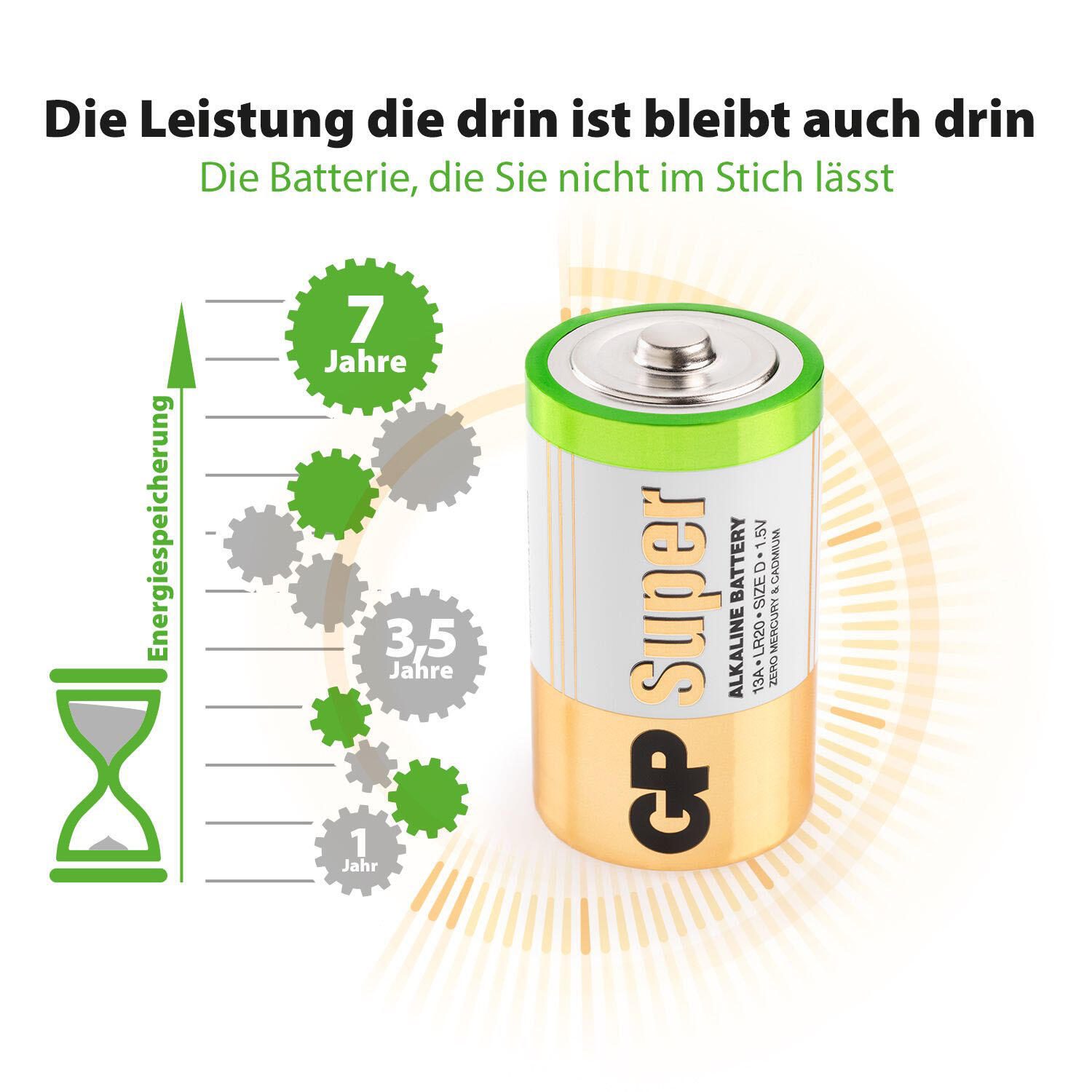 Die GP Batterien SUPER Mono D 1.5 V sind die ideale Wahl für all deine Geräte mit hohem Energiebedarf. Diese hochwertigen Alkali-Mangan-Batterien bieten eine zuverlässige und langanhaltende Energiequelle, die sich perfekt für Anwendungen eignet, bei denen eine starke und konstante Leistung erforderlich ist. Ob du sie in Taschenlampen, Spielzeugen oder anderen energieintensiven Geräten verwendest, die GP SUPER Mono D Batterien liefern die notwendige Power, um deine Geräte effizient zu betreiben. Mit einer Packung bestehend aus vier Batterien bist du bestens ausgestattet, um deine Geräte über längere Zeiträume hinweg mit Energie zu versorgen. Die Batterien sind in der Typenbezeichnung Mono D, auch bekannt als LR 20, HR20 oder MN1300, erhältlich, was ihre Vielseitigkeit unterstreicht. Du kannst dich darauf verlassen, dass diese Batterien die Anforderungen selbst anspruchsvollster Geräte erfüllen. Die GP Batterien zeichnen sich durch ihre hohe Leistungsfähigkeit und Langlebigkeit aus, sodass du dir keine Sorgen um häufige Batteriewechsel machen musst. Das Alkali-Mangan-System sorgt für eine stabile Spannung und eine gleichmäßige Entladung, was die Nutzung deiner Geräte noch angenehmer macht. Vertraue auf die Qualität von GP, einem renommierten Hersteller, der für seine zuverlässigen Batterielösungen bekannt ist. Mit den GP SUPER Mono D Batterien bist du bestens gerüstet, um deine elektrischen Geräte jederzeit in Betrieb zu halten.Technische Daten