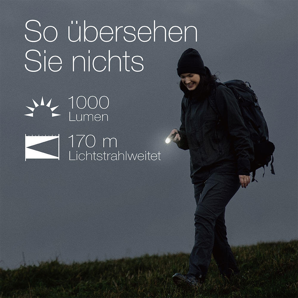 Die GP Taschenlampe in Schwarz ist ein zuverlässiges Beleuchtungswerkzeug für deine Bedürfnisse. Mit einer Leistung von 1.000 Lumen bietet sie helles Licht, das in verschiedenen Situationen nützlich ist. Durch ihre Ausführung aus robustem Flugzeugaluminium ist sie besonders widerstandsfähig und übersteht sogar einen Fall aus 1,0 m Höhe.