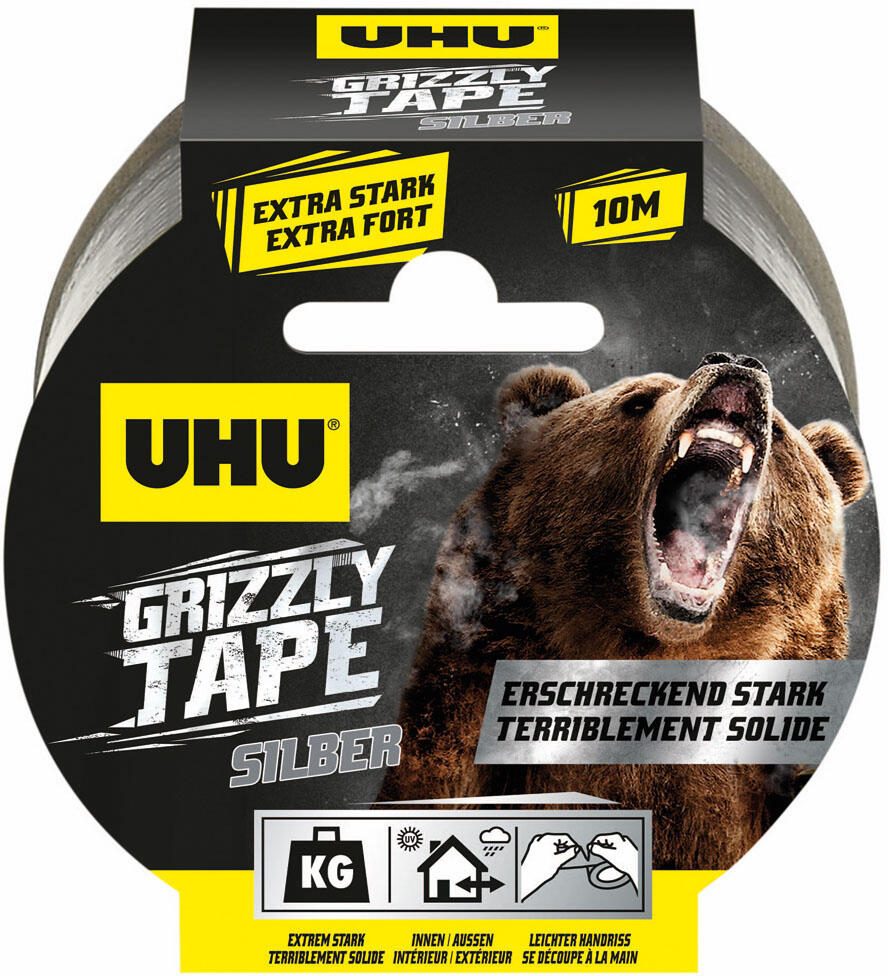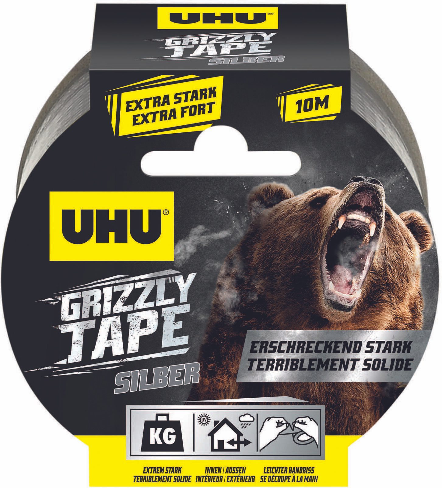 Das silberne Gewebeband eignet sich ideal für Reparaturen, Fixierungen oder auch als Verstärkung. Der Hersteller UHU steht für Qualität und Zuverlässigkeit, und dieses Produkt trägt die Bezeichnung "Grizzly Tape", was auf seine Robustheit und Stärke hinweist.