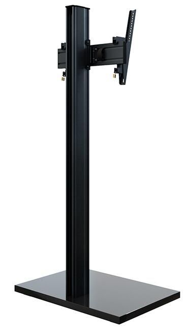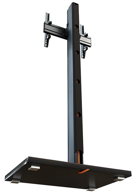 Der CPS Elia 160 Floorstand ist ein freistehendes Standsystem. Bildschirme mit einer Bildschirmdiagonale zwischen 46 – 65“ | 117 – 165 cm finden hier ihren Platz und können wahlweise in Landscape- oder Portrait-Ausrichtung montiert werden. Die VESA-Norm wird von min. VESA 100 mm bis max. VESA 400 mm abgedeckt. Die VESA-Arme können von 0 – 20° geneigt werden und zudem optional mit einem Schloss abgesichert werden. Das Rail ist entlang der Alu Pillars montageseitig höhenverstellbar und bieten so ganz flexible Montagemöglichkeiten, abgestimmt auf die jeweilige Raumsituation oder den verbauten Bildschirm. Die Kabelführung mittels Kabelclips erfolgt rückseitig entlang des Rails und der Säule und bleibt außer Sicht. Die Oberflächen der einzelnen Komponenten werden durch eine schlag- und kratzfesten Pulverbeschichtung in schwarz geschützt. Die MDF-Bodenplatte hingegen hat eine schwarze Hochglanzoberfläche. Die maximale Traglast des Systems beträgt 40 kg. Die Komplettlösungen sind mit den Einzelkomponenten der comPROnents®-Serie uneingeschränkt kombinier- und erweiterbar und bieten so weitere Einsatzmöglichkeiten.