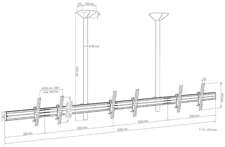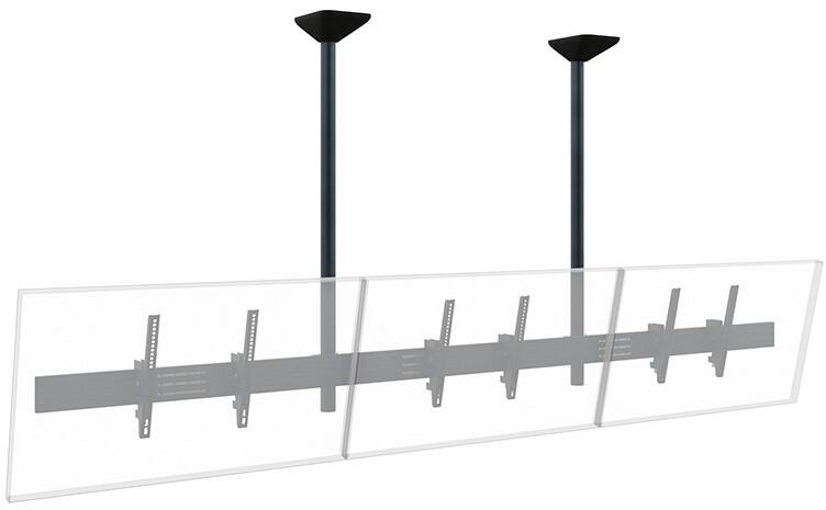 Das CPS Menuboard D3L 46 – 65“ ist ein System zur Deckenmontage. Das System eignet sich für drei Bildschirme zwischen 46 – 65“ | 117 – 165 cm Bildschirmdiagonale, welche nebeneinander montiert werden. Die Bildschirmmontage erfolgt in Landscape-Ausrichtung.