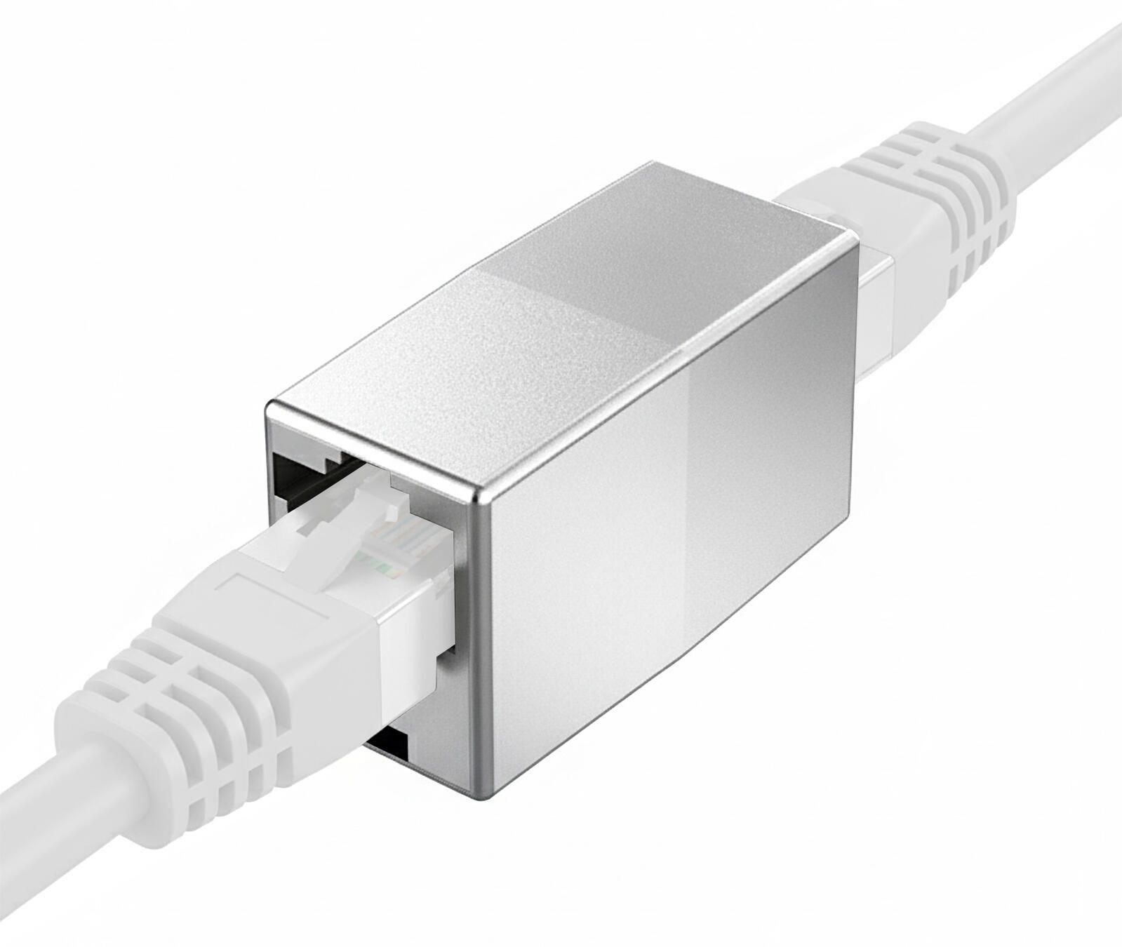 Der Adapter ist in einem silbernen Farbton gehalten und zeichnet sich durch sein einfaches Design aus, das eine unkomplizierte Handhabung ermöglicht. Mit zwei RJ45-Buchsen ausgestattet, lässt sich der Adapter flexibel in bestehende Netzwerkinfrastrukturen integrieren, um Kabelverbindungen zu verlängern oder zu verbinden.