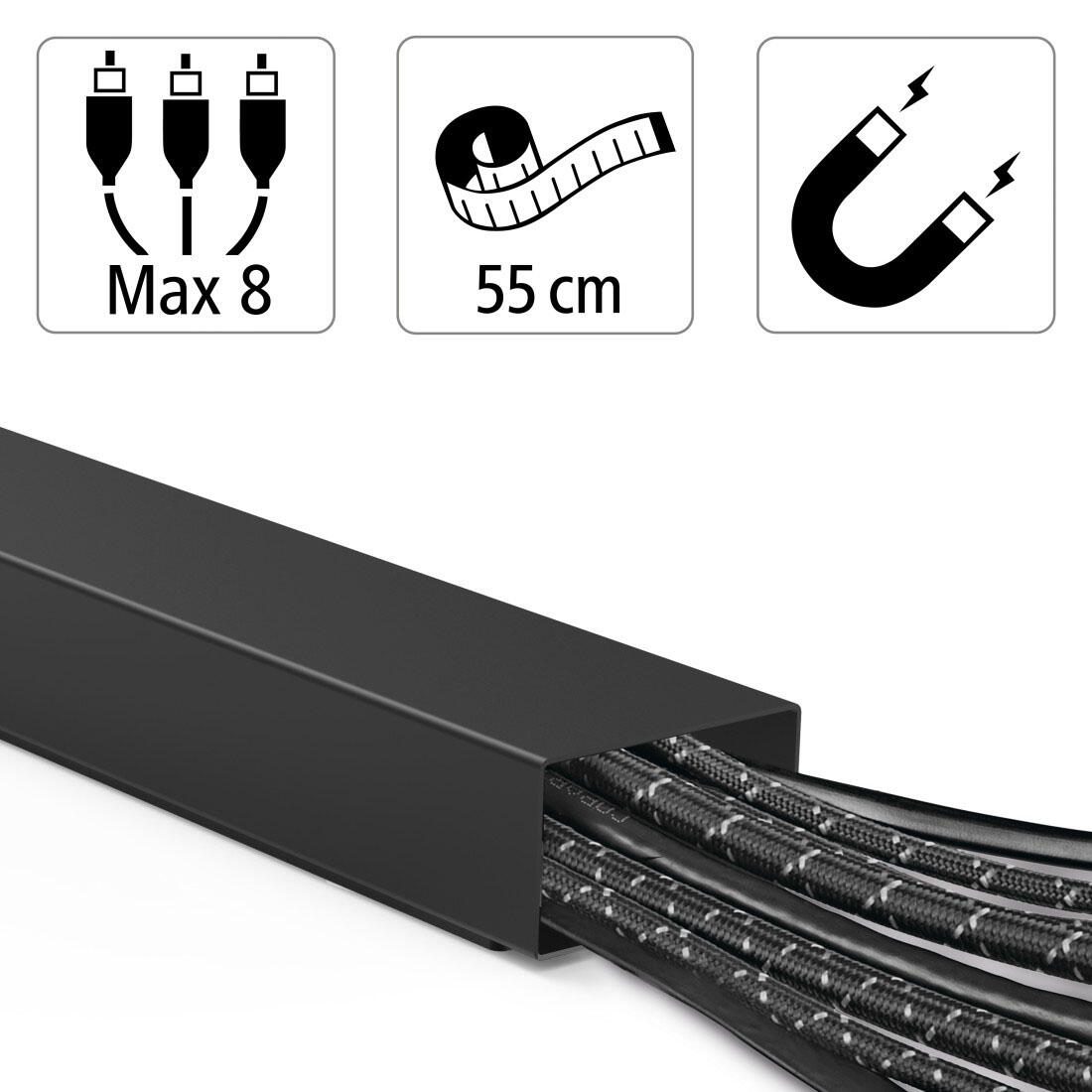 Der Hama Kabelkanal in der eleganten Farbe schwarz ist die ideale Lösung für alle, die Ordnung und Übersichtlichkeit in ihrem Kabelsalat schaffen möchten. Mit einer Länge von 55 cm bietet dieser Kabelkanal ausreichend Platz für bis zu 8 verschiedene Kabeltypen, darunter Stromkabel, USB-Kabel, HDMI-Kabel, Netzwerk- und Audiokabel. So kannst du deine Geräte effizient verbinden und gleichzeitig einen aufgeräumten Arbeitsplatz oder Wohnbereich genießen. Hergestellt aus robustem Metall, zeichnet sich der Hama Kabelkanal durch seine Langlebigkeit und Stabilität aus, was ihn zu einer ausgezeichneten Wahl für den täglichen Gebrauch macht. Die magnetische Befestigung ermöglicht eine einfache und flexible Anbringung, sodass du den Kabelkanal mühelos an verschiedenen Oberflächen anbringen kannst. Im Lieferumfang sind neben dem Kabelkanal auch zwei Magnetstreifen und zwei Klebestreifen enthalten, die dir zusätzliche Optionen für die Montage bieten. Die durchdachte Konstruktion des Kabelkanals sorgt dafür, dass alle Kabel sicher und ordentlich verstaut werden. Dies schützt nicht nur die Kabel selbst, sondern trägt auch dazu bei, Stolperfallen zu vermeiden und die Sicherheit in deinem Zuhause oder Büro zu erhöhen. Mit dem Hama Kabelkanal kannst du also nicht nur für eine ansprechende Optik sorgen, sondern auch für mehr Sicherheit und Funktionalität in deinem Alltag. Der Hama Kabelkanal ist nicht nur praktisch, sondern fügt sich auch nahtlos in verschiedene Einrichtungsstile ein. Egal, ob im Wohnzimmer, Büro oder im Home-Office – dank seines schlichten Designs und der neutralen Farbe passt er sich harmonisch an jede Umgebung an. Entscheide dich für den Hama Kabelkanal 55 cm schwarz und erlebe, wie einfach es sein kann, Ordnung zu schaffen und gleichzeitig das Kabelmanagement zu optimieren.Technische Daten