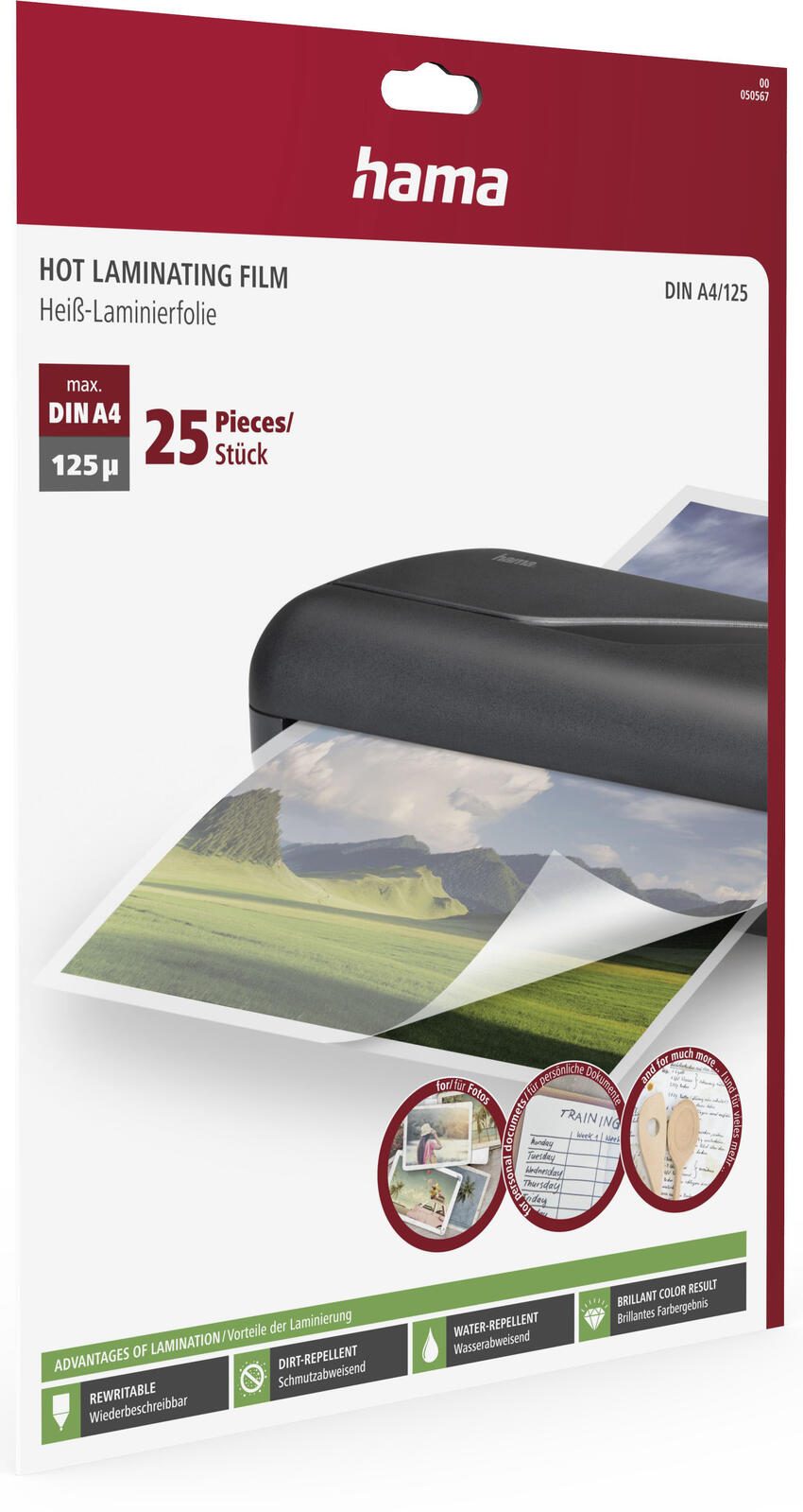 Die Hama Laminierfolien glänzend mit einer Stärke von 125 Mikron sind die ideale Lösung, um Dokumente, Fotos oder wichtige Unterlagen professionell zu laminieren und zu schützen. Mit einem Format von A4 bieten diese Folien ausreichend Platz für deine individuellen Projekte. Die glänzende Oberfläche sorgt nicht nur für einen ansprechenden Look, sondern verstärkt auch die Farben und Details deiner laminierte Materialien, wodurch sie lebendiger und attraktiver wirken. Jede Packung enthält 25 Laminierfolien, die aus hochwertigem Polyester (PET) und Ethyl-Vinyl-Acetat (EVA) gefertigt sind. Diese Materialien garantieren eine hohe Haltbarkeit und Flexibilität, sodass du sicher sein kannst, dass deine Dokumente optimal geschützt sind. Die Folien sind nicht selbstklebend und verfügen über abgerundete Ecken, was die Handhabung erleichtert und ein Verknicken oder Beschädigen der Kanten verhindert. Mit einer Größe von 21,6 x 30,3 cm sind die Laminierfolien perfekt für gängige A4-Dokumente geeignet. Du kannst sie problemlos in Laminiergeräten verwenden, um deine Papiere vor Feuchtigkeit, Schmutz und Abnutzung zu schützen. Egal, ob du Präsentationen, Menükarten, Bastelarbeiten oder persönliche Erinnerungsstücke laminiert – die Hama Laminierfolien bieten dir die nötige Qualität und Zuverlässigkeit. Die Verwendung dieser Laminierfolien ist nicht nur praktisch, sondern auch eine einfache Möglichkeit, um deine Dokumente aufzuwerten und ihnen eine professionelle Note zu verleihen. Vertraue auf die bewährte Qualität von Hama und genieße die Vorteile, die diese Laminierfolien dir bieten.Technische Daten
