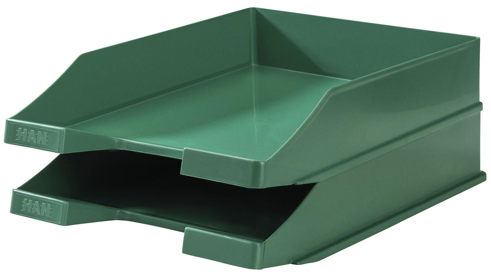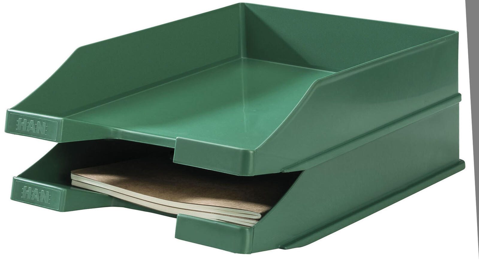 Die HAN Briefablage DIN C4 in einem ansprechenden Grünton ist die perfekte Lösung für die ordentliche Ablage und Organisation deiner Dokumente. Mit ihren Außenmaßen von 25,5 x 34,8 x 6,5 cm bietet sie ausreichend Platz für alle Formate bis DIN C4. Ob wichtige Unterlagen, Zeitschriften oder Briefe, diese Briefablage sorgt dafür, dass alles an seinem Platz bleibt und leicht zugänglich ist. Ein herausragendes Merkmal dieser Briefablage ist das verwendete Material. Sie besteht aus hochwertigem recyceltem Kunststoff, was nicht nur umweltfreundlich ist, sondern auch für eine hohe Stabilität und Langlebigkeit sorgt. Der grüne Farbton verleiht deinem Arbeitsplatz eine frische Note und sorgt für eine angenehme Atmosphäre. Die HAN Briefablage ist nicht nur funktional, sondern auch ein stilvolles Accessoire für jedes Büro oder Homeoffice. Dank der durchdachten Konstruktion ist die Briefablage nicht nur leicht zu handhaben, sondern auch äußerst praktisch. Du kannst sie problemlos stapeln und so den verfügbaren Platz optimal nutzen. Das schlichte, aber elegante Design fügt sich harmonisch in verschiedene Einrichtungsstile ein und sorgt dafür, dass deine Unterlagen immer ordentlich und übersichtlich bleiben. Mit der HAN Briefablage DIN C4 grün erhältst du nicht nur ein praktisches Büro-Accessoire, sondern auch ein Produkt, das Nachhaltigkeit und Stil vereint. Sie ist die ideale Wahl für alle, die Wert auf Ordnung und Umweltbewusstsein legen.Technische Daten