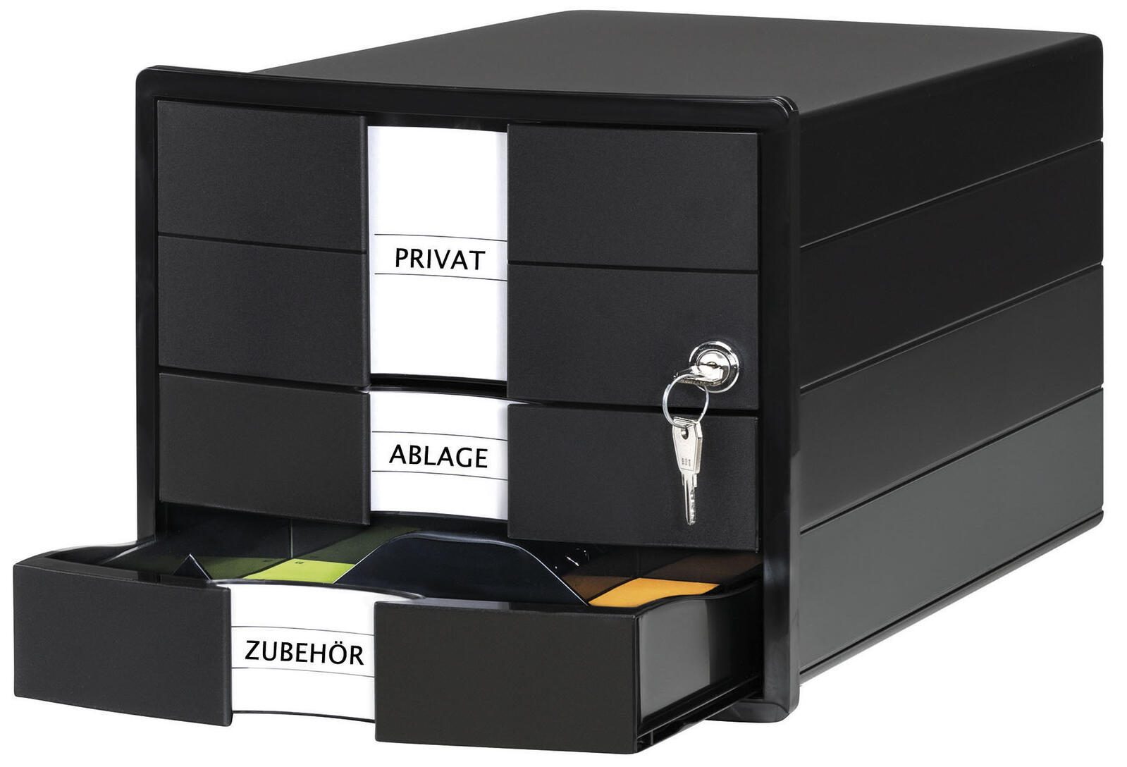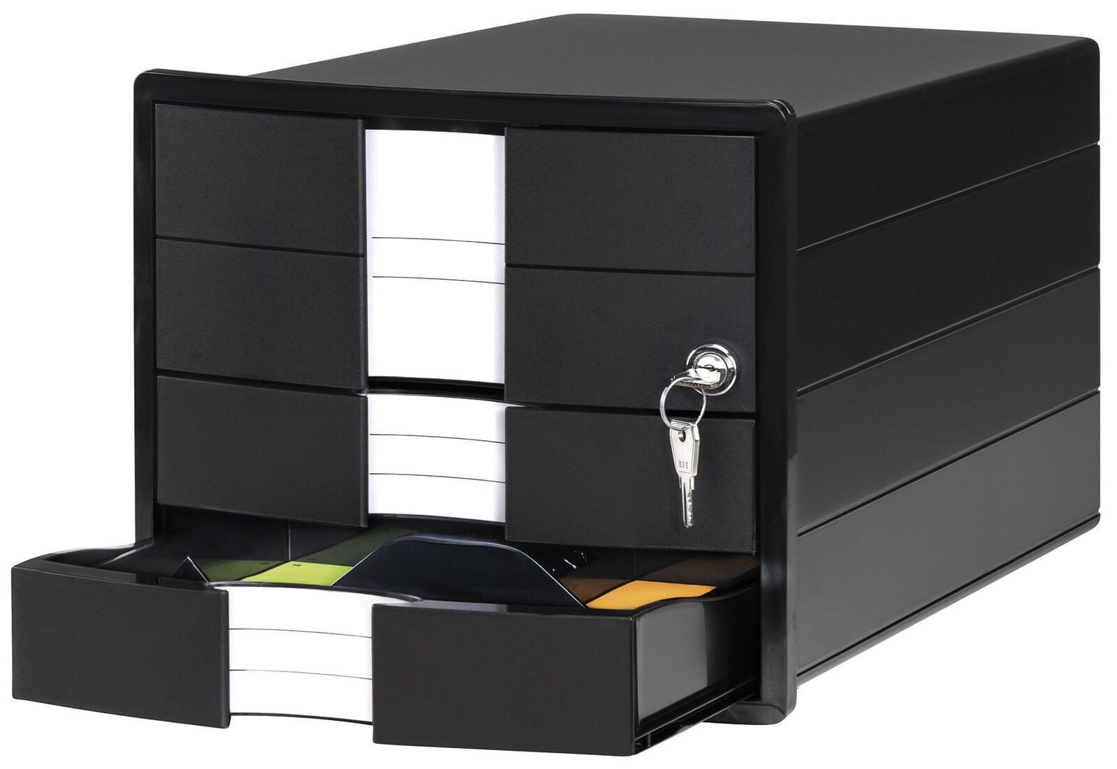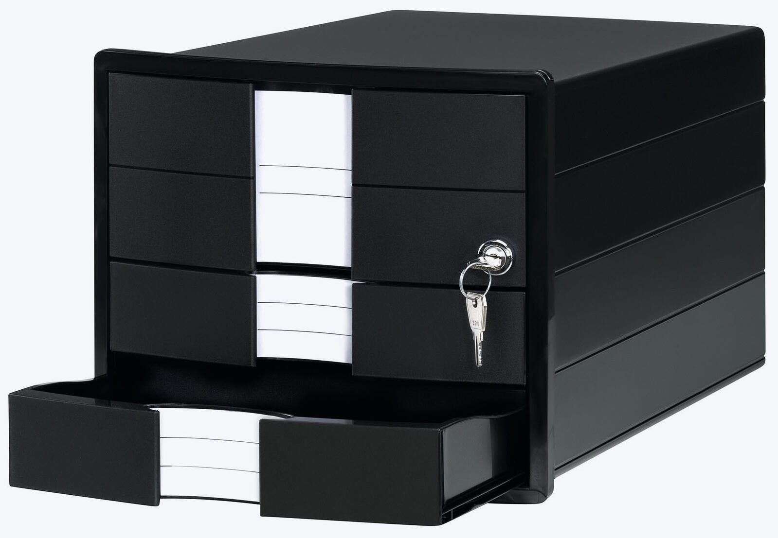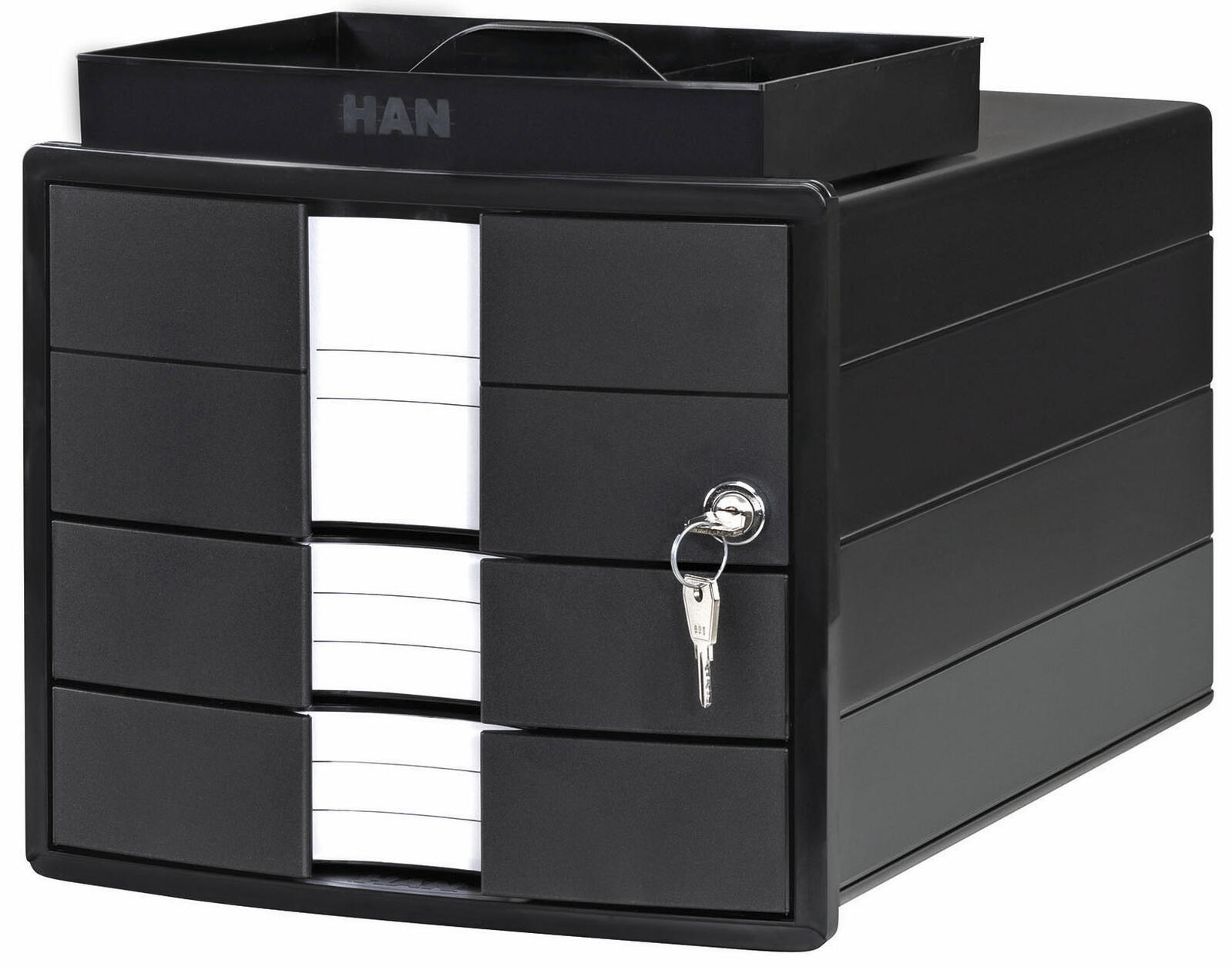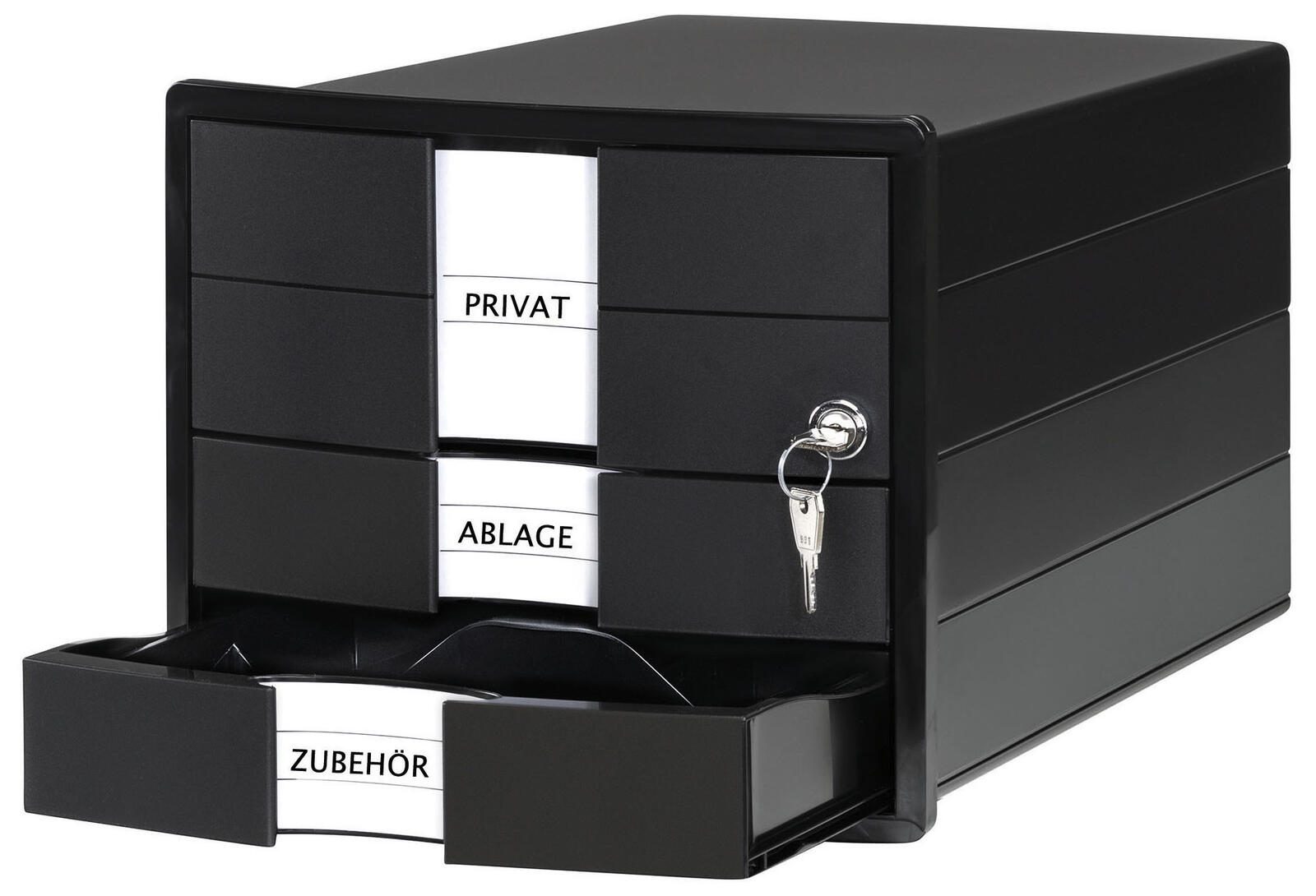 Die HAN Schubladenbox 1018-13 ist die ideale Lösung für die geordnete Aufbewahrung von Dokumenten im Format DIN C4. Mit den kompakten Maßen von 28,0 x 36,7 x 23,5 cm bietet sie ausreichend Platz für wichtige Unterlagen, während sie gleichzeitig durch ihr elegantes Design besticht. Die Schublade in ansprechendem Schwarz fügt sich nahtlos in jedes Büro- oder Wohnambiente ein und sorgt für eine aufgeräumte Arbeitsumgebung. Ein herausragendes Merkmal dieser Schubladenbox ist die oberste Schublade, die mit einem Zylinderschloss ausgestattet ist. Dies gewährleistet nicht nur die Sicherheit deiner Dokumente, sondern bietet auch einen zusätzlichen Schutz vor unbefugtem Zugriff. So kannst du sicher sein, dass deine sensiblen Unterlagen stets gut aufgehoben sind. Die Schubladenbox ist aus hochwertigem Polystyrol gefertigt, was für Langlebigkeit und Stabilität sorgt. Darüber hinaus ist sie stapelbar, was dir ermöglicht, mehrere Boxen platzsparend übereinander zu lagern. Dies ist besonders praktisch in Umgebungen, in denen der Platz begrenzt ist. Die HAN Schubladenbox 1018-13 ist nicht nur funktional, sondern auch ästhetisch ansprechend. Sie bietet eine perfekte Kombination aus Sicherheit, Praktikabilität und modernem Design, die in jedem Büro oder Homeoffice einen Platz findet. Egal, ob du wichtige Dokumente, Verträge oder andere Unterlagen aufbewahren möchtest, diese Schubladenbox ist die perfekte Wahl für eine organisierte und stilvolle Aufbewahrung.Technische Daten