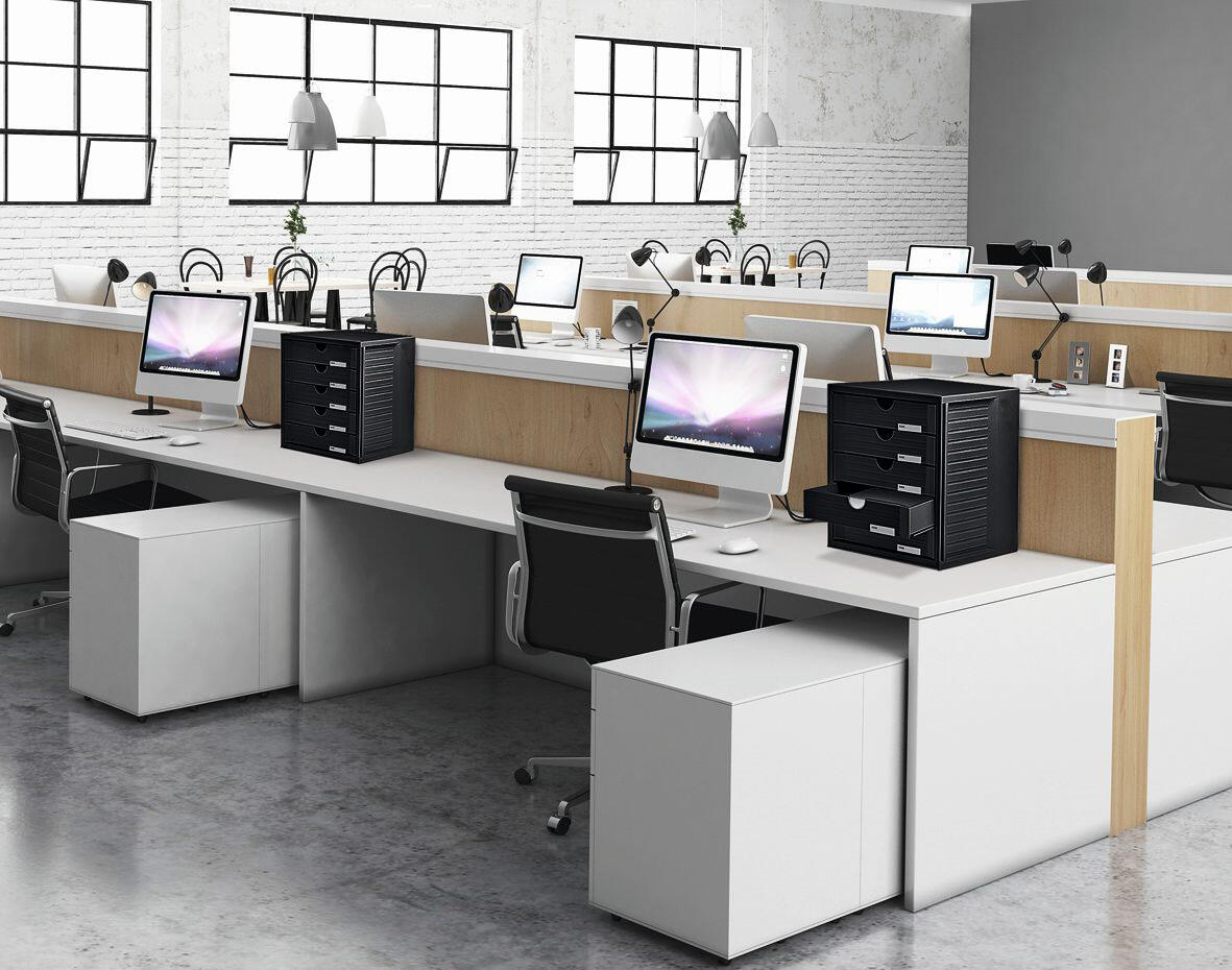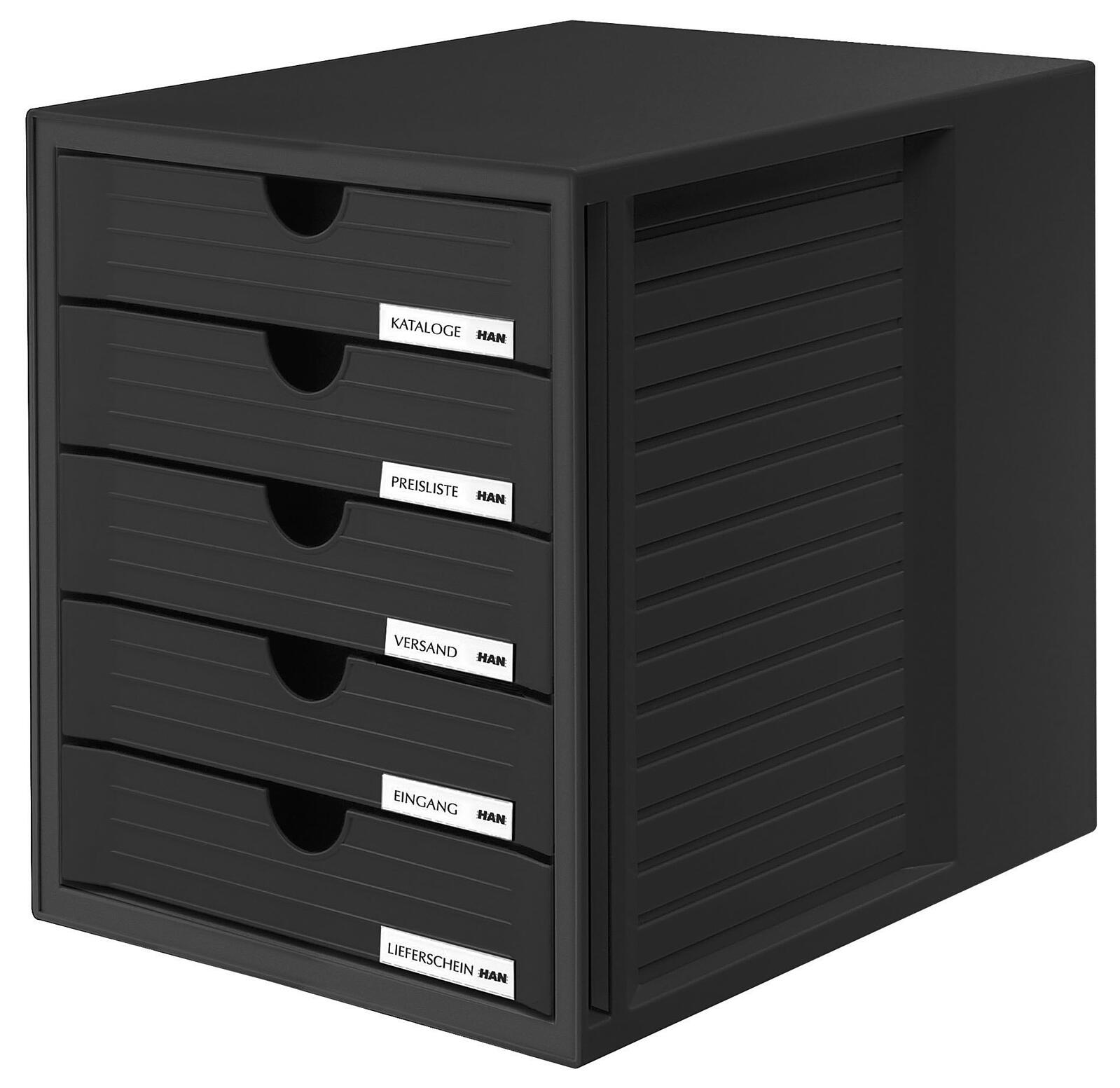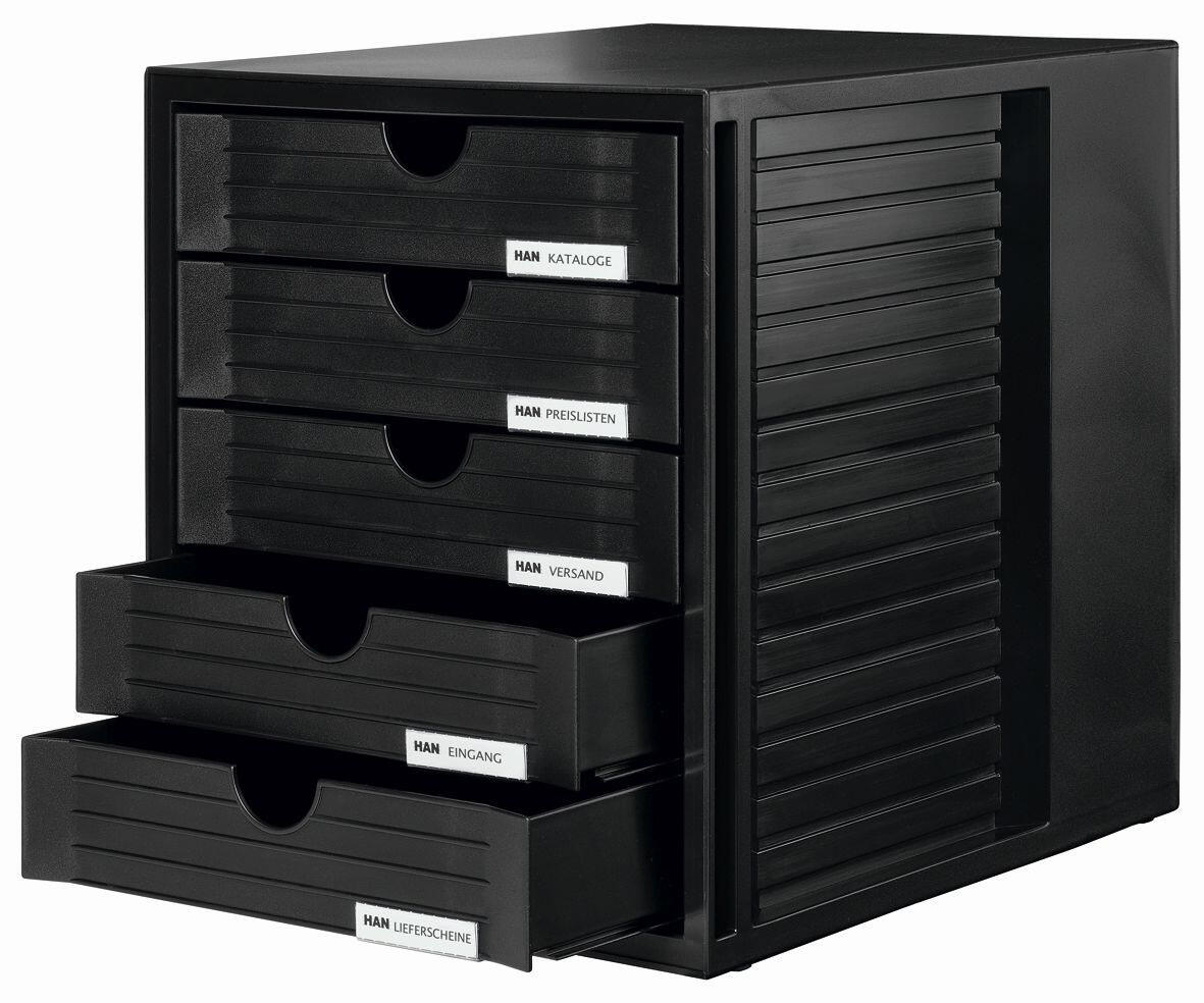 Die HAN Schubladenbox 1450-13 ist die ideale Lösung zur übersichtlichen und sicheren Aufbewahrung von Dokumenten im DIN C4 Format. Mit ihren kompakten Abmessungen von 27,5 x 33,0 x 32,0 cm passt sie perfekt in jedes Büro oder Zuhause und sorgt für Ordnung auf deinem Schreibtisch. Diese elegante Schubladenbox in klassischem Schwarz vereint Funktionalität mit einem ansprechenden Design. Die Schubladenbox bietet fünf geschlossene Schubladen, die dir ausreichend Platz für wichtige Unterlagen, Schreibmaterialien oder Büromaterialien bieten. Das antistatische, schwermetallfreie Polystyrol sorgt nicht nur für eine hohe Stabilität, sondern auch für eine sichere Aufbewahrung deiner Unterlagen. Dank der besonderen Materialbeschaffenheit bleibt die Box auch bei intensiver Nutzung in einwandfreiem Zustand. Ein weiteres Highlight dieser Schubladenbox ist ihre Stapelbarkeit. Du kannst mehrere Boxen übereinander stapeln, um den verfügbaren Platz optimal zu nutzen und gleichzeitig einen aufgeräumten Look zu gewährleisten. Egal, ob du die Box im Büro, im Homeoffice oder im Schulzimmer verwendest, sie passt sich flexibel deinen Bedürfnissen an. Die HAN Schubladenbox 1450-13 ist nicht nur funktional, sondern auch ein stilvolles Accessoire, das in jedes Umfeld integriert werden kann. Mit dieser Box investierst du in eine langlebige und praktische Lösung, die dir hilft, deine Unterlagen sicher und geordnet aufzubewahren.Technische Daten
