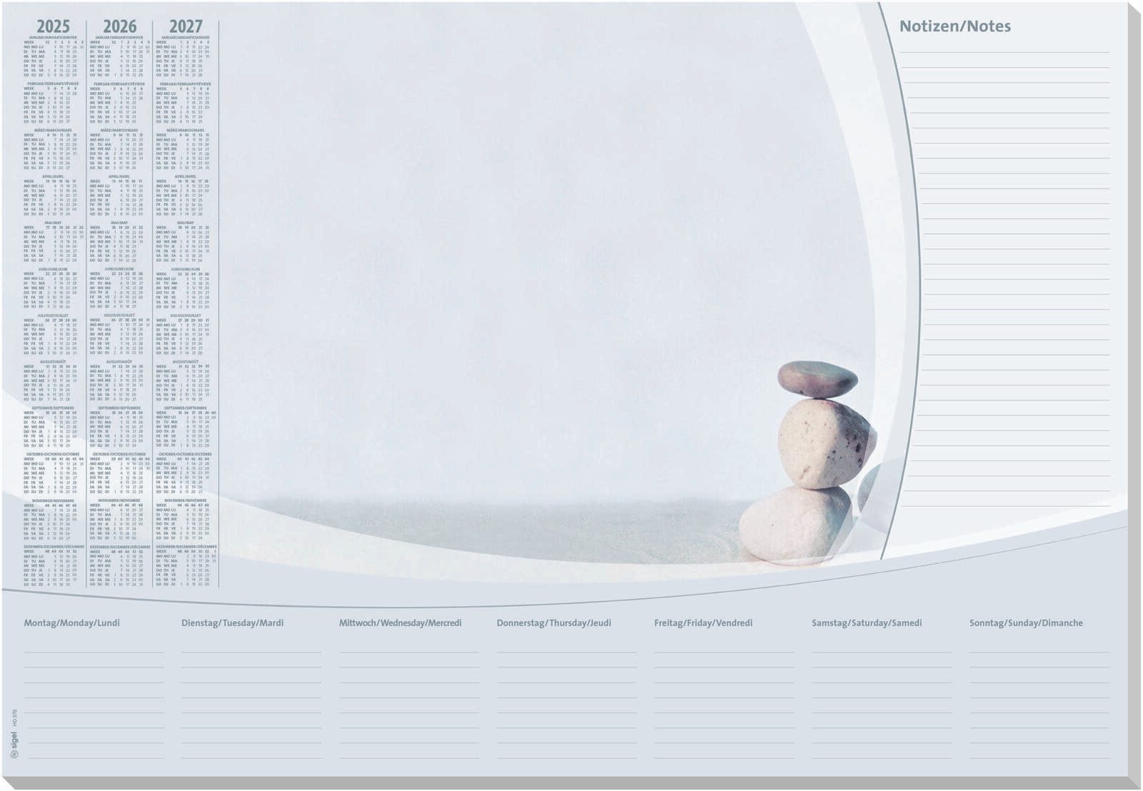 Die SIGEL Schreibtischunterlage vereint Funktionalität und ästhetisches Design in einem praktischen Produkt. Mit den großzügigen Maßen von 59,5 x 41,0 cm bietet sie ausreichend Platz für Notizen, Zeichnungen oder die Organisation deiner täglichen Aufgaben. Die elegante Farbgestaltung in weiß/grau schafft eine harmonische Atmosphäre an deinem Arbeitsplatz und fördert die Konzentration. Hergestellt aus hochwertigem Papier mit einem Gewicht von 80 g/m², sorgt die Unterlage für eine angenehme Haptik und ist gleichzeitig robust genug, um den täglichen Anforderungen standzuhalten. Die Unterseite aus Karton verleiht der Schreibtischunterlage zusätzliche Stabilität und verhindert ein Verrutschen auf deinem Tisch. Mit 30 Seiten bietet sie dir genügend Platz, um deine Gedanken festzuhalten und deine Projekte zu planen. Das Motiv „Harmonie“ der SIGEL Schreibtischunterlage ist nicht nur ein visuelles Highlight, sondern unterstützt auch eine produktive Arbeitsumgebung. Durch ihre klare und ansprechende Gestaltung trägt sie dazu bei, dass du dich auf das Wesentliche konzentrieren kannst, ohne von unnötigen Ablenkungen umgeben zu sein. Diese Schreibtischunterlage ist die ideale Wahl für alle, die Wert auf Ordnung und Stil legen. Die SIGEL Schreibtischunterlage ist nicht nur funktional, sondern auch ein stilvolles Accessoire für dein Büro oder Homeoffice. Sie unterstützt dich dabei, deine Ideen kreativ zu entfalten und sorgt für einen klaren Kopf bei der Arbeit.Technische Daten