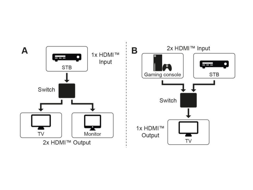 • Bidirektionaler HDMI™-Switch, der 1x HDMI™-Eingangssignal auf 2x HDMI™-Endgeräte wie Displays weiterleitet oder wahlweise 2x Eingangssignale auf 1x Endgerät, Hinweis: Der HDMI™-Umschalter funktioniert nicht als Splitter!