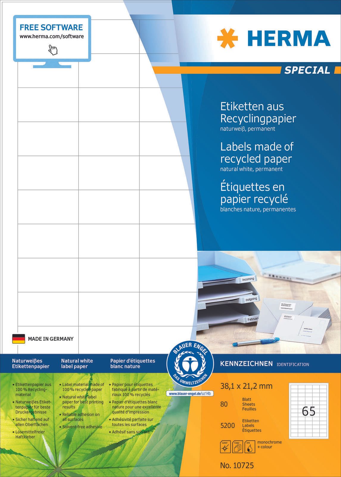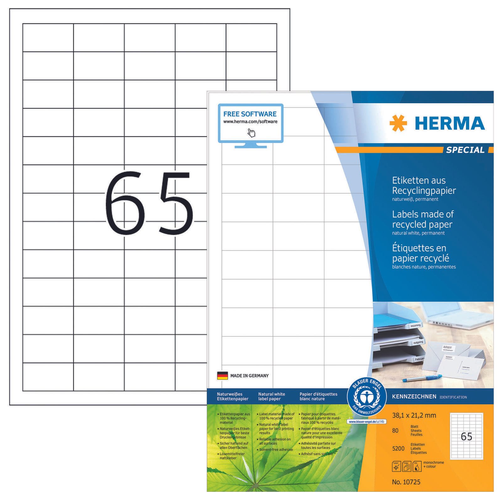 Die HERMA Etiketten 10725 in klassischem Weiß sind die ideale Lösung für alle, die Wert auf Qualität und Nachhaltigkeit legen. Mit einer Größe von 38,1 x 21,2 mm bieten diese rechteckigen Universaletiketten ausreichend Platz für deine Beschriftungen, sei es für das Büro, den Versand oder die Organisation im Haushalt. Die Etiketten sind auf einem praktischen A4-Bogen angeordnet, was die Handhabung und den Druck erleichtert. Jede Packung enthält 5200 Etiketten, die aus hochwertigem Recycling-Papier gefertigt sind. Dieses Material ist nicht nur umweltfreundlich, sondern auch chlorfrei gebleicht und lösemittelfrei, was die HERMA Etiketten zu einer sicheren Wahl für verschiedene Anwendungen macht. Die matte Oberfläche sorgt dafür, dass deine Druckergebnisse klar und gut lesbar sind. Du kannst die Etiketten problemlos mit Inkjet-Druckern, Kopierern oder Schwarz-Weiß-Laserdruckern bedrucken, wodurch sie sich perfekt für individuelle Beschriftungen eignen. Die selbstklebenden Etiketten sind sehr einfach in der Anwendung: Sie haften zuverlässig und lassen sich ohne Ablösehilfe anbringen. Mit abgerundeten Ecken und einem rundum Rand bieten sie zudem eine ansprechende Optik. Obwohl die Etiketten nicht blickdicht sind, sind sie dennoch vielseitig einsetzbar und bieten eine hervorragende Lösung für alle, die eine klare und einfache Kennzeichnung benötigen. Entscheide dich für die HERMA Etiketten 10725 und profitiere von einer umweltbewussten und praktischen Lösung für deine Beschriftungsbedürfnisse.Technische Daten