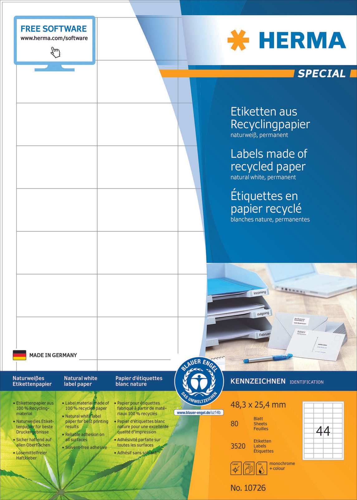 Die HERMA Etiketten 10726 in klassischem Weiß sind die ideale Lösung für all deine Beschriftungsbedürfnisse. Mit einer Größe von 48,3 x 25,4 mm bieten diese rechteckigen Universaletiketten genügend Platz für deine individuellen Texte und Designs. Jedes Pack enthält beeindruckende 3520 Etiketten, verteilt auf 80 A4-Blätter, was sie zu einer äußerst wirtschaftlichen Wahl für den Büro- oder Heimgebrauch macht. Hergestellt aus hochwertigem Recycling-Papier, sind diese Etiketten nicht nur umweltfreundlich, sondern auch chlorfrei gebleicht und holzfrei. Sie tragen somit zu einer nachhaltigen Nutzung bei und sind eine verantwortungsvolle Wahl für umweltbewusste Verbraucher. Die matte Oberfläche sorgt dafür, dass deine Druckergebnisse klar und professionell aussehen, egal ob du einen Inkjet-Drucker, einen Kopierer oder einen Schwarz-Weiß-Laserdrucker verwendest. Die selbstklebenden HERMA Etiketten sind einfach in der Handhabung und bieten eine zuverlässige Haftung auf verschiedenen Oberflächen. Sie sind nicht ablösbar, was bedeutet, dass du dir keine Sorgen um das Ablösen oder Verrutschen machen musst. Mit abgerundeten Ecken und einem durchgängigen Rand sind sie zudem optisch ansprechend und passen sich harmonisch in dein Beschriftungskonzept ein. Die HERMA Etiketten 10726 sind ideal für eine Vielzahl von Anwendungen, sei es für das Etikettieren von Ordnern, das Beschriften von Geschenken oder das Organisieren von Materialien im Büro. Ihre Vielseitigkeit und die hohe Anzahl pro Packung machen sie zu einem unverzichtbaren Hilfsmittel für jeden, der Wert auf Ordnung und Übersichtlichkeit legt.Technische Daten