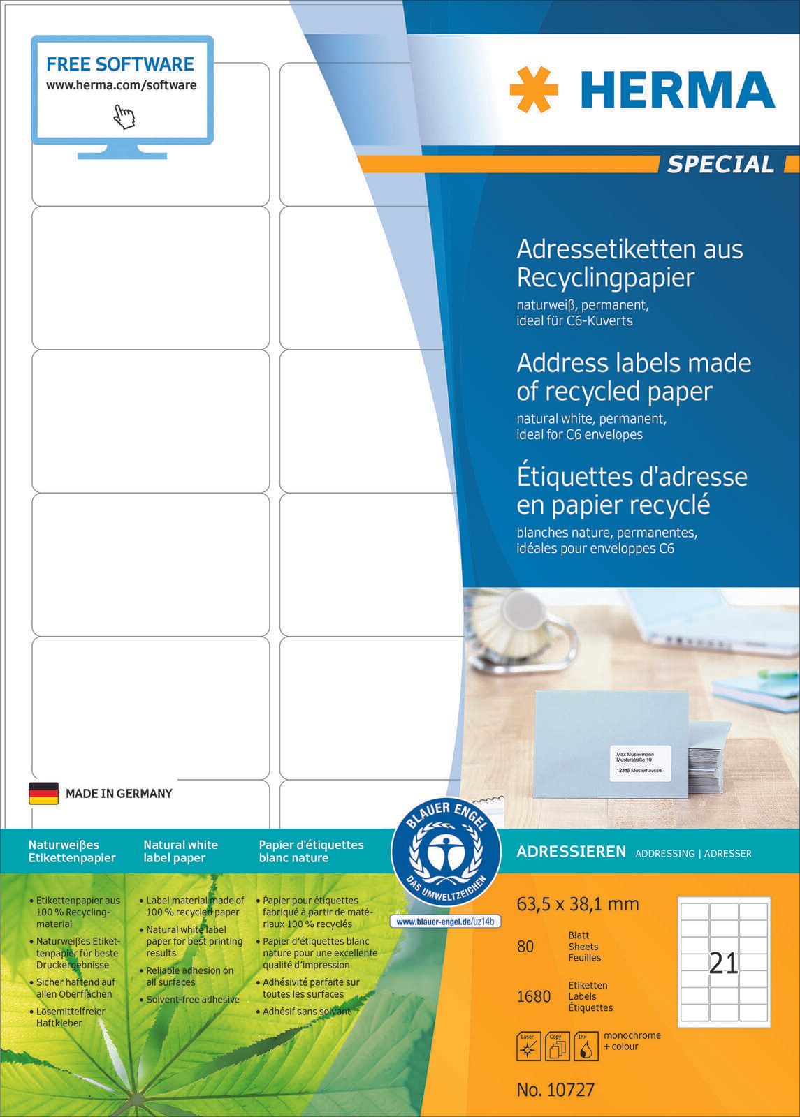 Die HERMA Etiketten 10727 in strahlendem Weiß sind die ideale Lösung für all deine Beschriftungsbedürfnisse. Mit einer praktischen Größe von 63,5 x 38,1 mm bieten diese rechteckigen Universaletiketten ausreichend Platz für deine Texte und Designs. Jedes Pack enthält 1680 Etiketten, verteilt auf 80 Blatt, was sie zu einer wirtschaftlichen Wahl für den täglichen Einsatz macht. Hergestellt aus hochwertigem Recycling-Papier, sind diese Etiketten nicht nur umweltfreundlich, sondern auch besonders vielseitig. Sie sind selbstklebend und lassen sich problemlos mit einem Inkjet-Drucker, Kopierer oder Schwarz-Weiß-Laser bedrucken, sodass du deine Etiketten ganz nach deinen Wünschen gestalten kannst. Die matte Oberfläche sorgt für ein ansprechendes Finish und ermöglicht eine klare Lesbarkeit deiner Druckergebnisse. Die HERMA Etiketten zeichnen sich durch ihre abgerundeten Ecken aus, die nicht nur für eine ansprechende Optik sorgen, sondern auch die Handhabung erleichtern. Sie sind chlorfrei gebleicht und lösemittelfrei, was die Verwendung in verschiedenen Umgebungen sicher macht. Die Etiketten sind nicht blickdicht, was dir die Möglichkeit gibt, sie über bestehende Beschriftungen zu kleben, ohne dass der alte Text durchscheint. Ob für das Beschriften von Ordnern, das Etikettieren von Produkten oder für kreative Bastelprojekte, die HERMA Etiketten 10727 bieten dir eine zuverlässige und anpassbare Lösung. Die hohe Qualität und die umweltfreundlichen Materialien machen sie zu einer hervorragenden Wahl für alle, die Wert auf Nachhaltigkeit und Funktionalität legen.Technische Daten