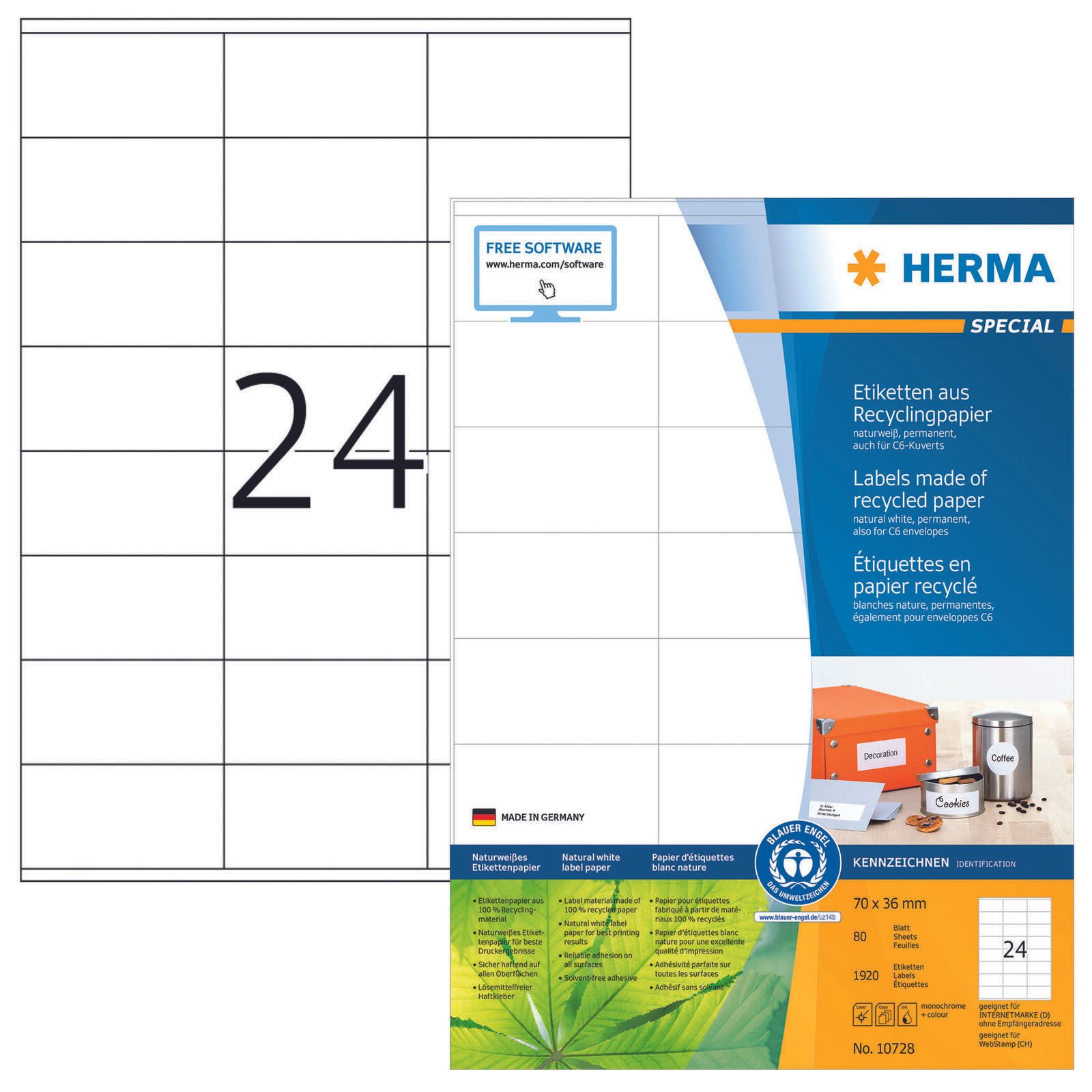 Die HERMA Etiketten 10728 in strahlendem Weiß sind die perfekte Lösung für all deine Beschriftungsbedürfnisse. Mit einer praktischen Größe von 70,0 x 36,0 mm bieten diese rechteckigen Universaletiketten ausreichend Platz für Texte, Logos oder andere wichtige Informationen. Jedes Pack enthält 1920 Etiketten auf 80 A4-Blättern, sodass du immer genügend Vorrat hast, egal ob für den Bürobedarf, das Home-Office oder für kreative Projekte. Hergestellt aus hochwertigem Recycling-Papier sind diese Etiketten nicht nur umweltfreundlich, sondern auch äußerst vielseitig. Sie sind selbstklebend und lassen sich mühelos auf verschiedene Oberflächen anbringen. Die matte Oberfläche sorgt dafür, dass deine Druckergebnisse klar und professionell aussehen. Die Etiketten sind mit Inkjet-Druckern, Kopierern und SW-Laserdruckern bedruckbar, was dir die Flexibilität gibt, sie nach deinen individuellen Bedürfnissen zu gestalten. Dank der chlorfreien Bleichung und der lösemittelfreien Eigenschaften sind die HERMA Etiketten 10728 besonders umweltbewusst. Sie sind nicht nur funktional, sondern tragen auch dazu bei, die Umwelt zu schonen. Die Etiketten sind blickdicht und bieten somit eine klare und saubere Beschriftungsfläche, ohne dass der Untergrund durchscheint. Die Etiketten sind ideal für die Organisation von Dokumenten, das Beschriften von Ordnern oder das Kennzeichnen von Produkten. Ihre robuste Klebkraft sorgt dafür, dass sie an Ort und Stelle bleiben, ohne sich abzulösen. Die abgerundeten Ecken bieten ein ansprechendes Design, während der Rand an Kopf und Fuß für eine präzise Anordnung sorgt. Mit den HERMA Etiketten 10728 erhältst du ein Produkt, das Funktionalität, Qualität und Umweltbewusstsein vereint.Technische Daten