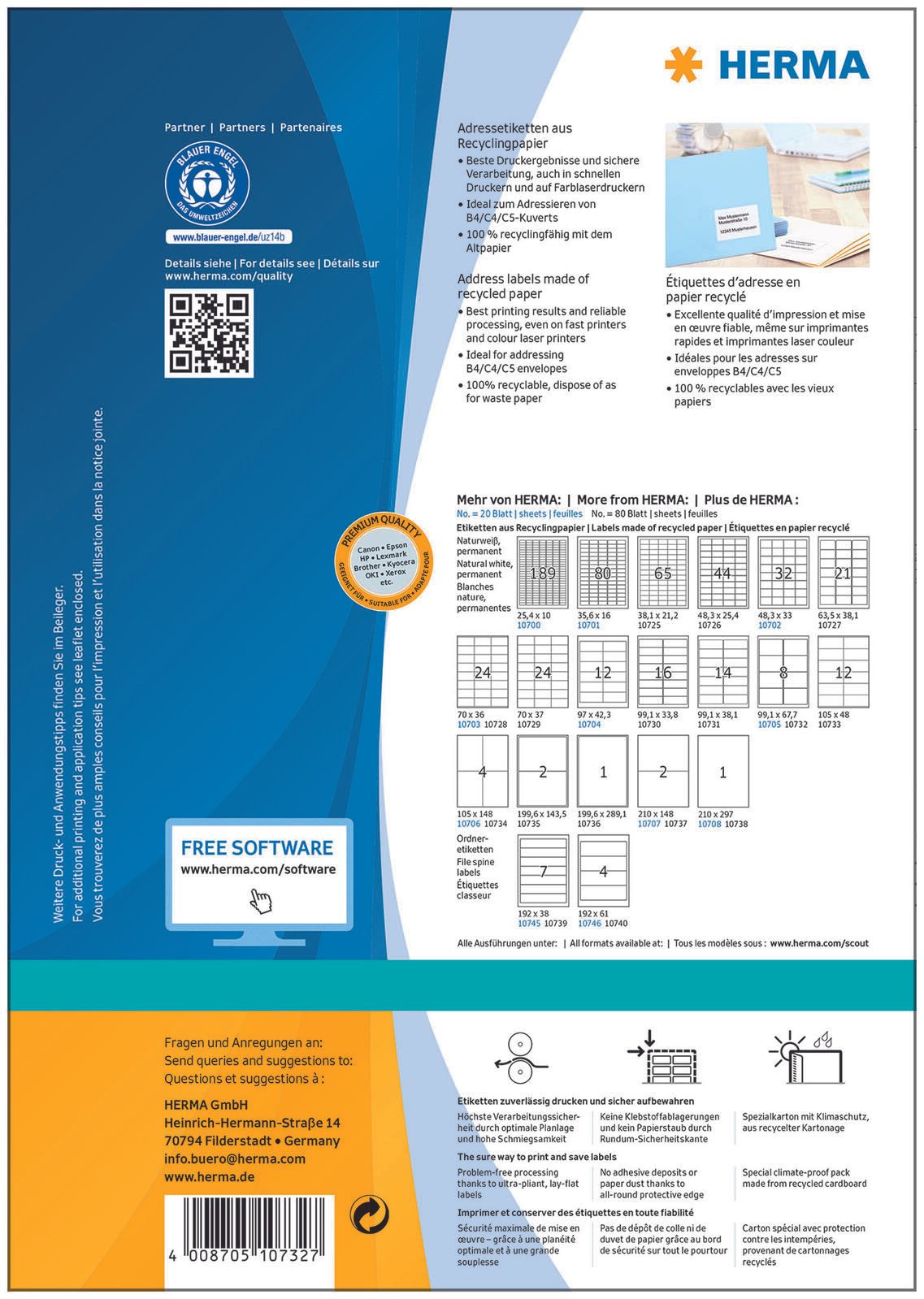Die HERMA Etiketten 10732 in klassischem Weiß sind die ideale Lösung für alle, die Wert auf Qualität und Vielseitigkeit legen. Mit einer praktischen Größe von 99,1 x 67,7 mm bieten diese rechteckigen Etiketten ausreichend Platz für deine individuellen Beschriftungen. Egal, ob du sie für das Ordnen von Dokumenten, das Etikettieren von Produkten oder für kreative Bastelprojekte benötigst, diese Etiketten sind vielseitig einsetzbar und erfüllen deine Anforderungen mühelos. Jede Packung enthält 80 Blatt, was dir eine große Menge an Etiketten bietet, um deine Projekte effizient umzusetzen. Die hohe Qualität der HERMA Etiketten garantiert eine hervorragende Haftung auf verschiedenen Oberflächen, sodass du dir keine Sorgen um das Ablösen machen musst. Zudem sind die Etiketten einfach zu bedrucken, was dir die Möglichkeit gibt, sie nach deinen Wünschen zu gestalten und professionell aussehen zu lassen. Die HERMA Etiketten sind nicht nur praktisch, sondern auch umweltfreundlich, da sie aus nachhaltigen Materialien hergestellt werden. Du kannst sie bedenkenlos verwenden, während du gleichzeitig einen Beitrag zum Umweltschutz leistest. Die glatte Oberfläche sorgt dafür, dass Drucke gestochen scharf und klar erscheinen, was die Lesbarkeit deiner Etiketten erhöht. Vertraue auf die Qualität von HERMA, einem renommierten Hersteller, der für seine zuverlässigen Produkte bekannt ist. Mit den HERMA Etiketten 10732 bist du bestens ausgestattet, um deine Ideen in die Tat umzusetzen und deine Organisation auf ein neues Level zu heben.Technische Daten