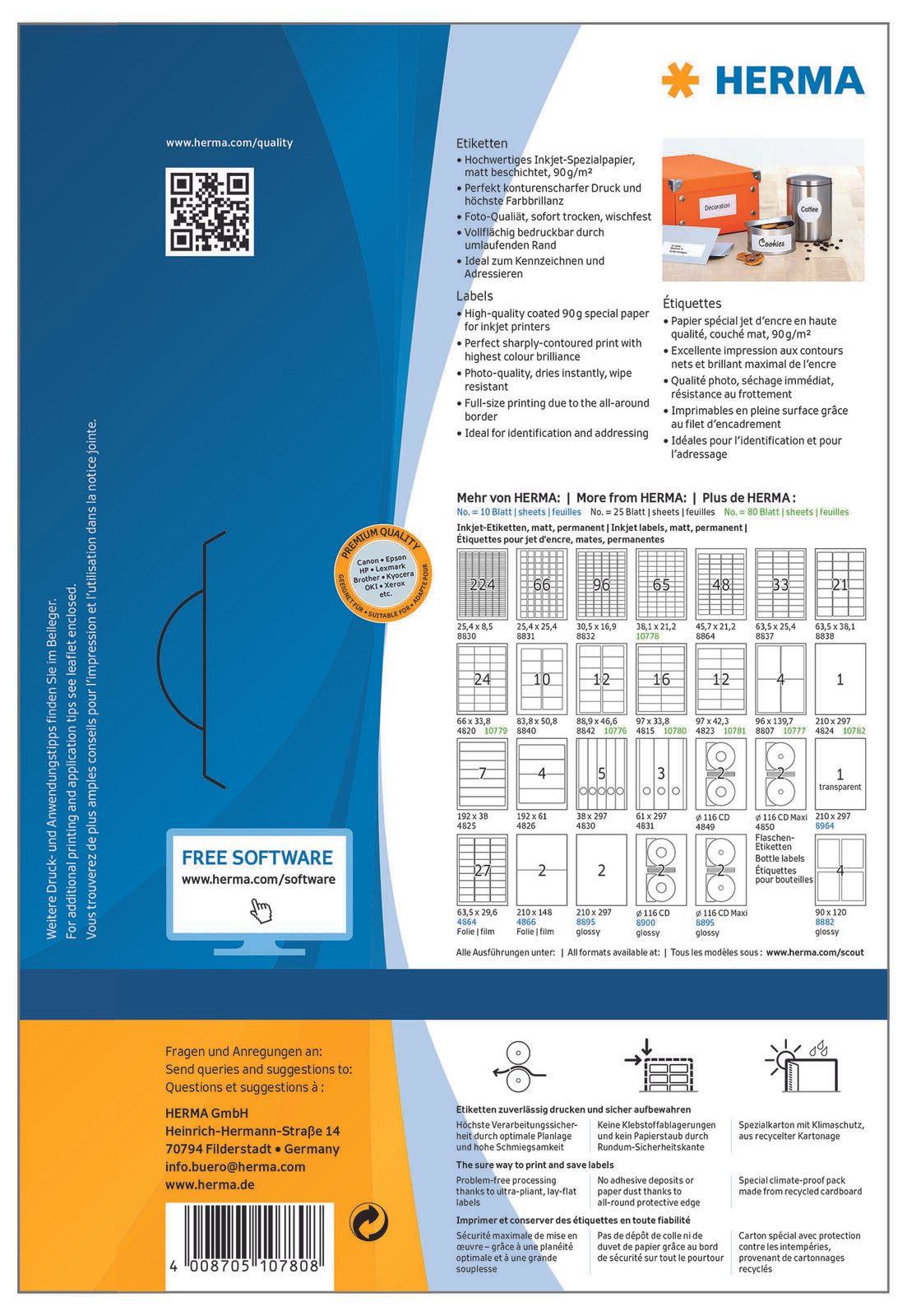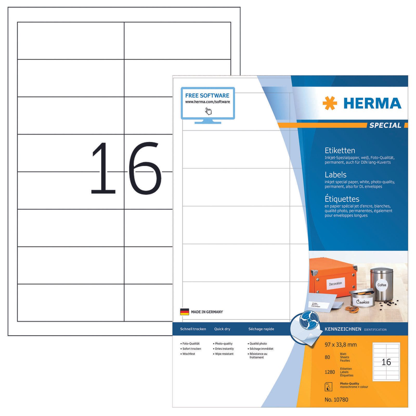 Ein Pack enthält 80 Blatt, was dir genügend Etiketten für zahlreiche Anwendungen bietet. Die HERMA Etiketten sind speziell für den Einsatz in Inkjet-Druckern konzipiert, sodass du deine Etiketten schnell und einfach selbst gestalten und drucken kannst. Die weiße Oberfläche sorgt dafür, dass deine Druckergebnisse klar und professionell aussehen. Die Etiketten haften zuverlässig auf verschiedenen Oberflächen, wodurch sie sich perfekt für das Beschriften von Ordnern, Paketen oder auch für das Etikettieren von Produkten eignen.