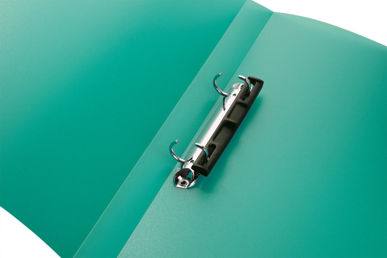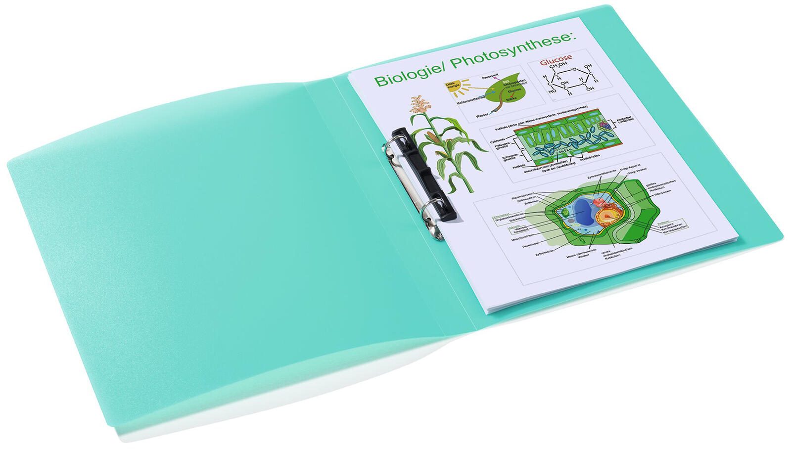 Die Abheftmechanik ist als 2-D-Ring-Mechanik ausgeführt, was das Einheften und Herausnehmen von Blättern erleichtert. Mit einem Füllvermögen von bis zu 120 Blatt ist das Ringbuch für den täglichen Gebrauch im Büro, in der Schule oder zu Hause gut geeignet. Ein Niederhalter sorgt dafür, dass die Blätter sicher fixiert bleiben, während auf einen Kantenschutz verzichtet wurde.