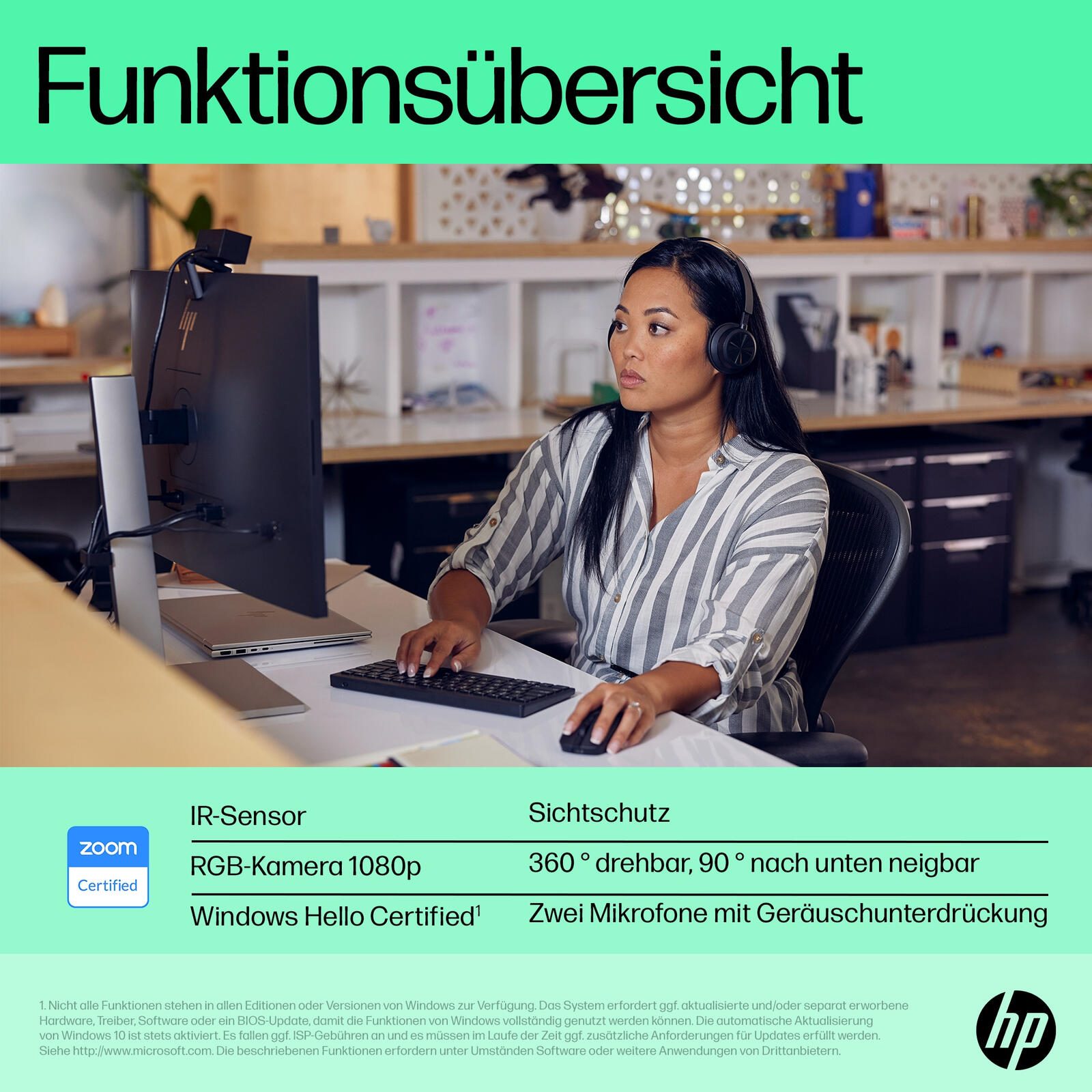 Rollladen für Privatsphäre, automatische Umrahmung, Auto Focus, 66° Sichtfeld (diagonal), 78° diagonaler Bildwinkel, 92° Sichtfeld (diagonal), 360° drehbar, 5x digitaler Zoom, kompatibel mit Windows Hello, noise reduction, Zoom Certified, kompatibel mit Microsoft Teams, kompatibel mit BlueJeans, WebEx-kompatibel, kompatibel mit Google Meet, kompatibel mit GoToMeeting, kompatibel mit Vidyo, kompatibel mit OBS, kompatibel mit XSplit, kompatibel mit Twitch, kompatibel mit YouTube, kompatibel mit Fuze