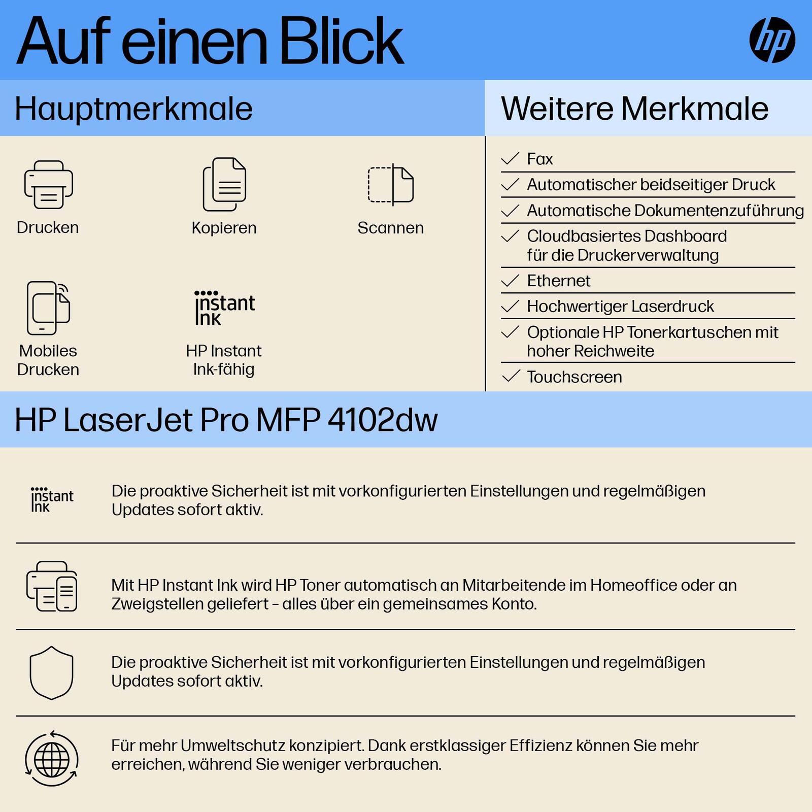 HP LaserJet Pro MFP 4102dw Multifunktionsgerät s/w A4, Drucker, Scanner, Kopierer, USB, LAN, WLAN, Duplex