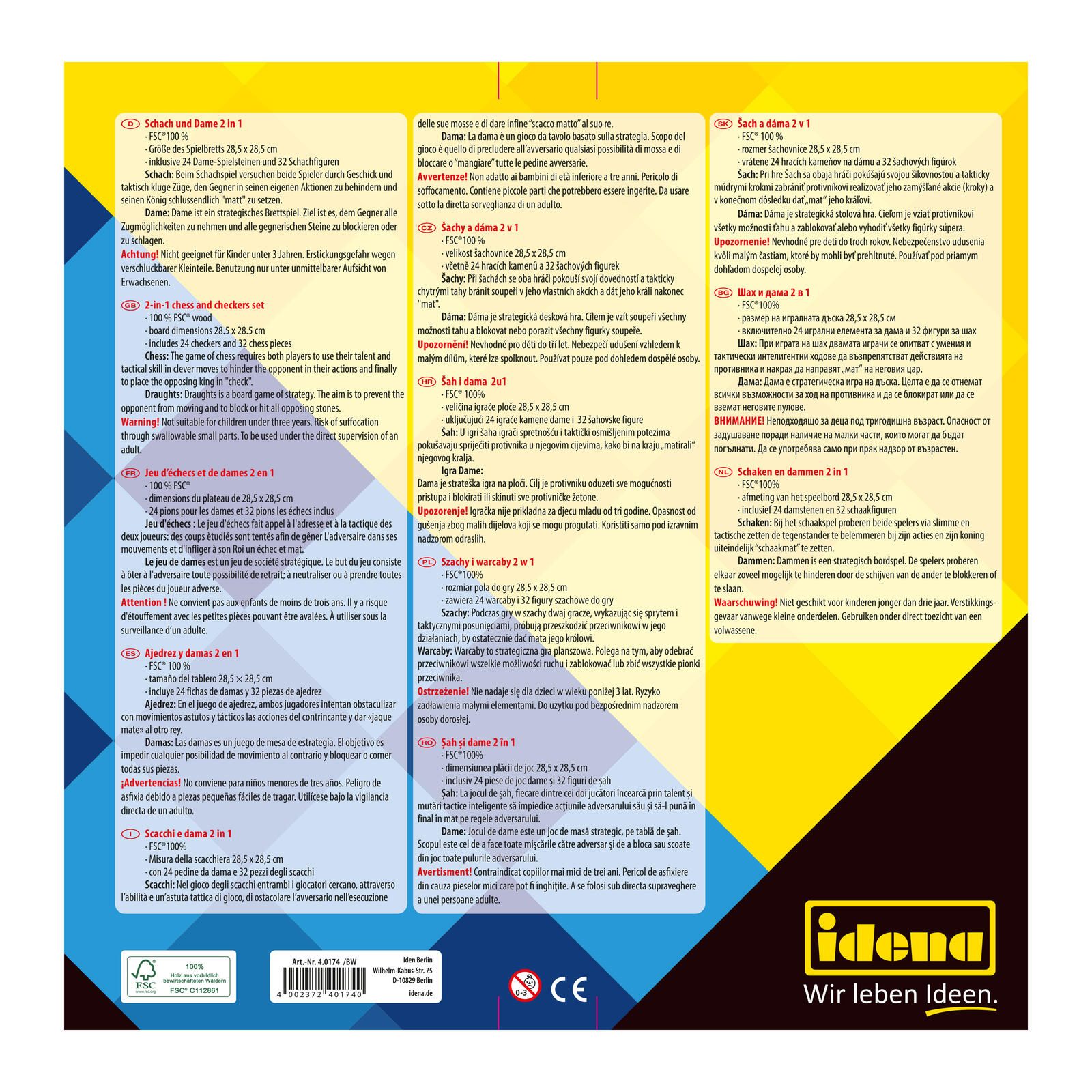 Die Marke Idena steht für Qualität und Spielvergnügen, und das 2in1 Schach und Dame Brettspiel ist da keine Ausnahme. Es ist die perfekte Wahl für alle, die sowohl die Eleganz des Schachspiels als auch die Einfachheit des Damespiels schätzen. Tauchen Sie ein in die Welt der Strategiespiele und genießen Sie unvergessliche Momente mit diesem vielseitigen Brettspiel.