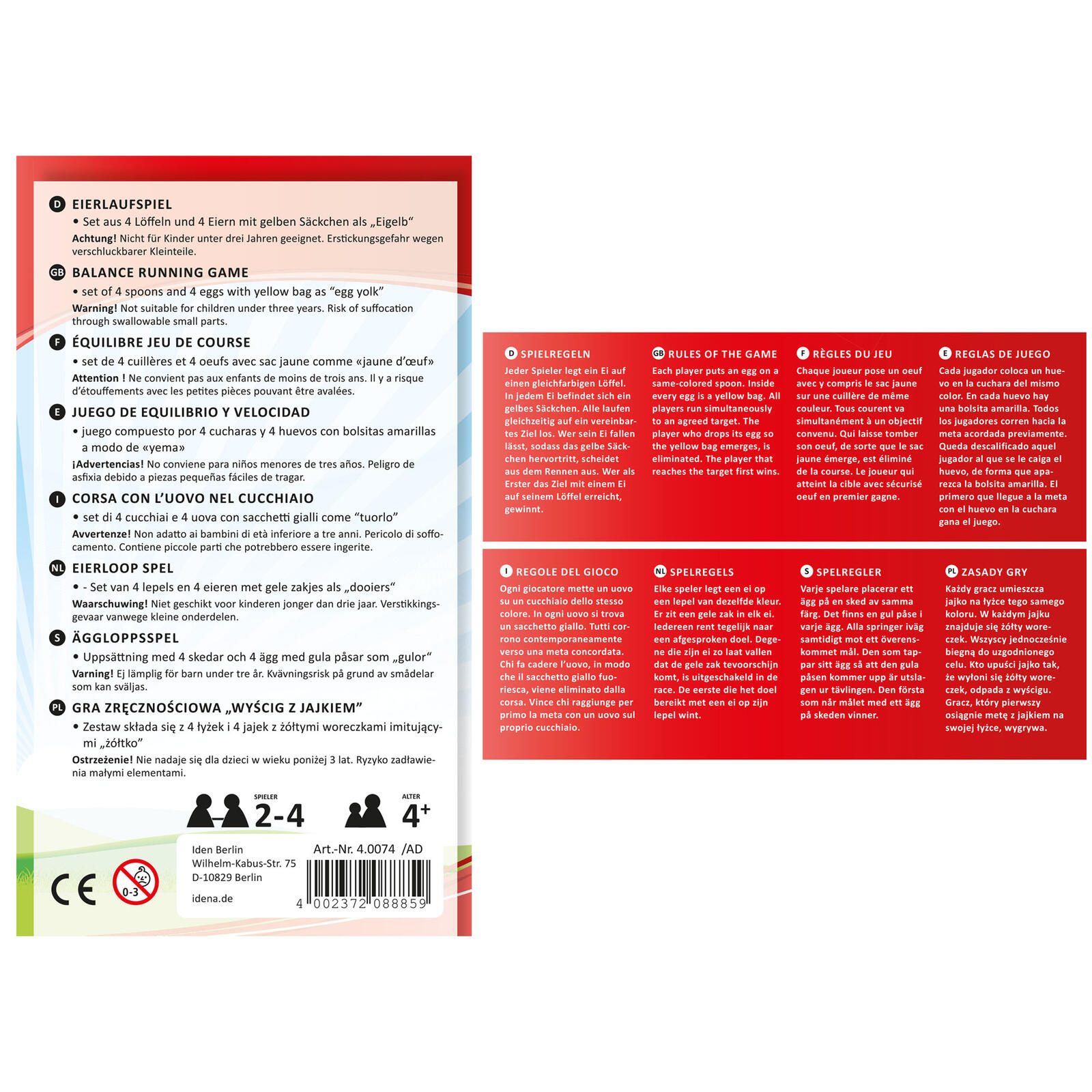 Das Idena Eierlaufspiel ist ein unterhaltsames Geschicklichkeitsspiel, das sowohl für Kinder als auch für Erwachsene geeignet ist. Mit einem Inhalt von einem Spiel bietet es Spaß für 2 bis 4 Spieler, wodurch es ideal für Familienabende oder gesellige Treffen mit Freunden ist. Die Altersbeschränkung ab 4 Jahren sorgt dafür, dass auch die Kleinsten in den Genuss dieses Spiels kommen können.