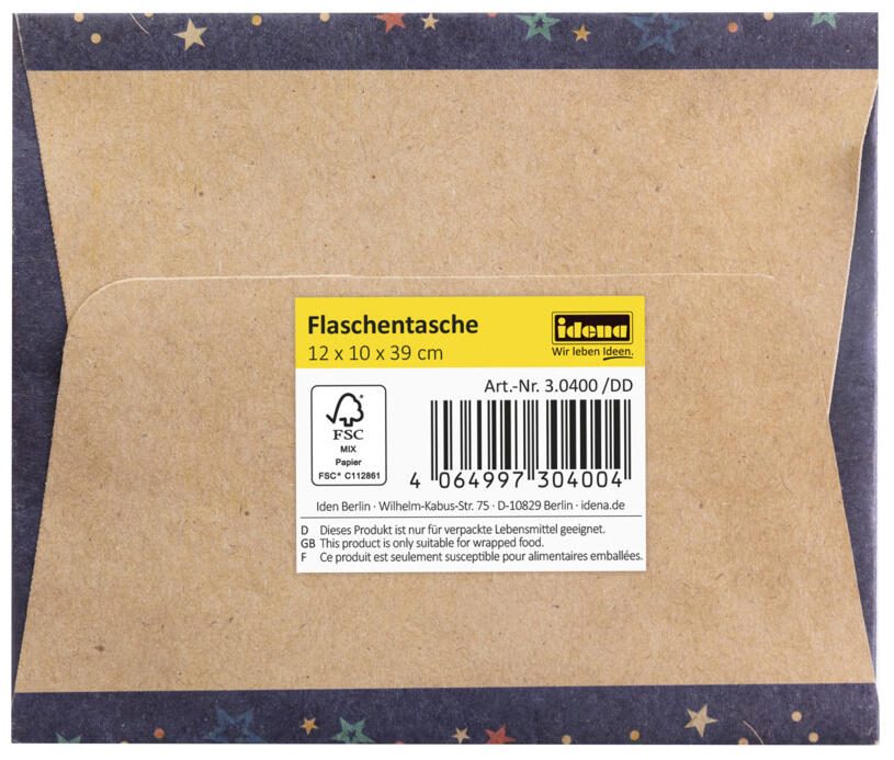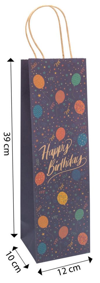 Diese Geschenktüte von Idena ist speziell für Flaschen konzipiert und eignet sich ideal als Verpackung für Geburtstagsgeschenke. Die Tüte ist mit dem Schriftzug „Happy Birthday“ bedruckt und trägt damit ein passendes Motiv für festliche Anlässe. Mit den Maßen von 12,0 cm Breite und 39,0 cm Höhe bietet sie ausreichend Platz für die meisten Standardflaschen.