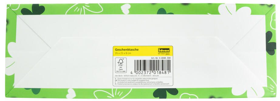Die Idena Geschenktüte mit Glücksklee Motiv ist eine praktische Tragetasche aus Kraftpapier, die sich ideal zum Verpacken von Geschenken eignet. Mit den Maßen von 25,0 x 35,0 cm bietet sie ausreichend Platz für verschiedenste Geschenkgrößen. Das grüne Design mit dem Glücksklee-Motiv verleiht der Tüte eine freundliche und ansprechende Optik.