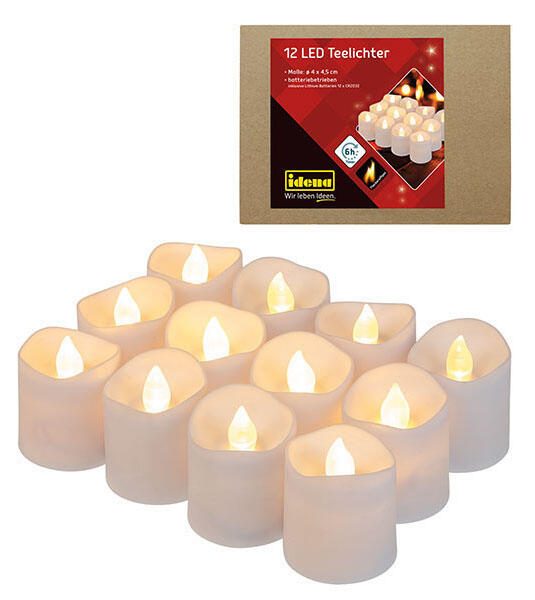 Die Idena LED-Teelichter mit einer Höhe von 4,5 cm und einem Durchmesser von 4 cm sind die perfekte Ergänzung für jede stimmungsvolle Atmosphäre. Diese eleganten Teelichter in einem klassischen Weiß verleihen deinem Zuhause einen Hauch von Gemütlichkeit und Eleganz, ohne die Sorgen, die mit echten Flammen verbunden sind. Besonders hervorzuheben ist der realistische Flackereffekt, der den Eindruck von echten Kerzen vermittelt. Ob für romantische Abende, festliche Anlässe oder einfach zur Dekoration – die Idena LED-Teelichter schaffen eine einladende Stimmung, die jeden Raum erhellt. Die integrierte 6-Stunden-Timer-Funktion sorgt dafür, dass sich die Teelichter automatisch ein- und ausschalten, was dir nicht nur Zeit spart, sondern auch eine zusätzliche Sicherheit bietet. Jedes Teelicht wird mit einer langlebigen Lithium-Knopfzelle CR2032 betrieben, die im Lieferumfang enthalten ist. So kannst du die Teelichter sofort nach dem Auspacken verwenden. Die Verpackungseinheit umfasst 12 Stück, was dir vielseitige Einsatzmöglichkeiten eröffnet. Egal, ob du sie einzeln oder in Gruppen anordnest, die Idena LED-Teelichter sind ideal für Tischdekorationen, Fensterbänke oder als stimmungsvolle Lichtquelle im Freien. Hergestellt aus hochwertigem Kunststoff, sind die Teelichter leicht und einfach zu handhaben. Sie sind nicht nur dekorativ, sondern auch praktisch, da sie keine Wachsspritzer hinterlassen und keine Brandgefahr darstellen. Verleihe deinem Wohnraum mit den Idena LED-Teelichtern einen warmen, einladenden Glanz und genieße die beruhigende Atmosphäre, die sie schaffen.