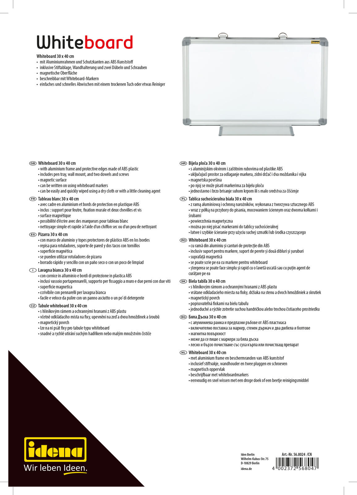 Idena Whiteboards Idena Whiteboard 40x30cm 40,0 x 30,0 cm kunststoffbeschichteter Stahl weiß