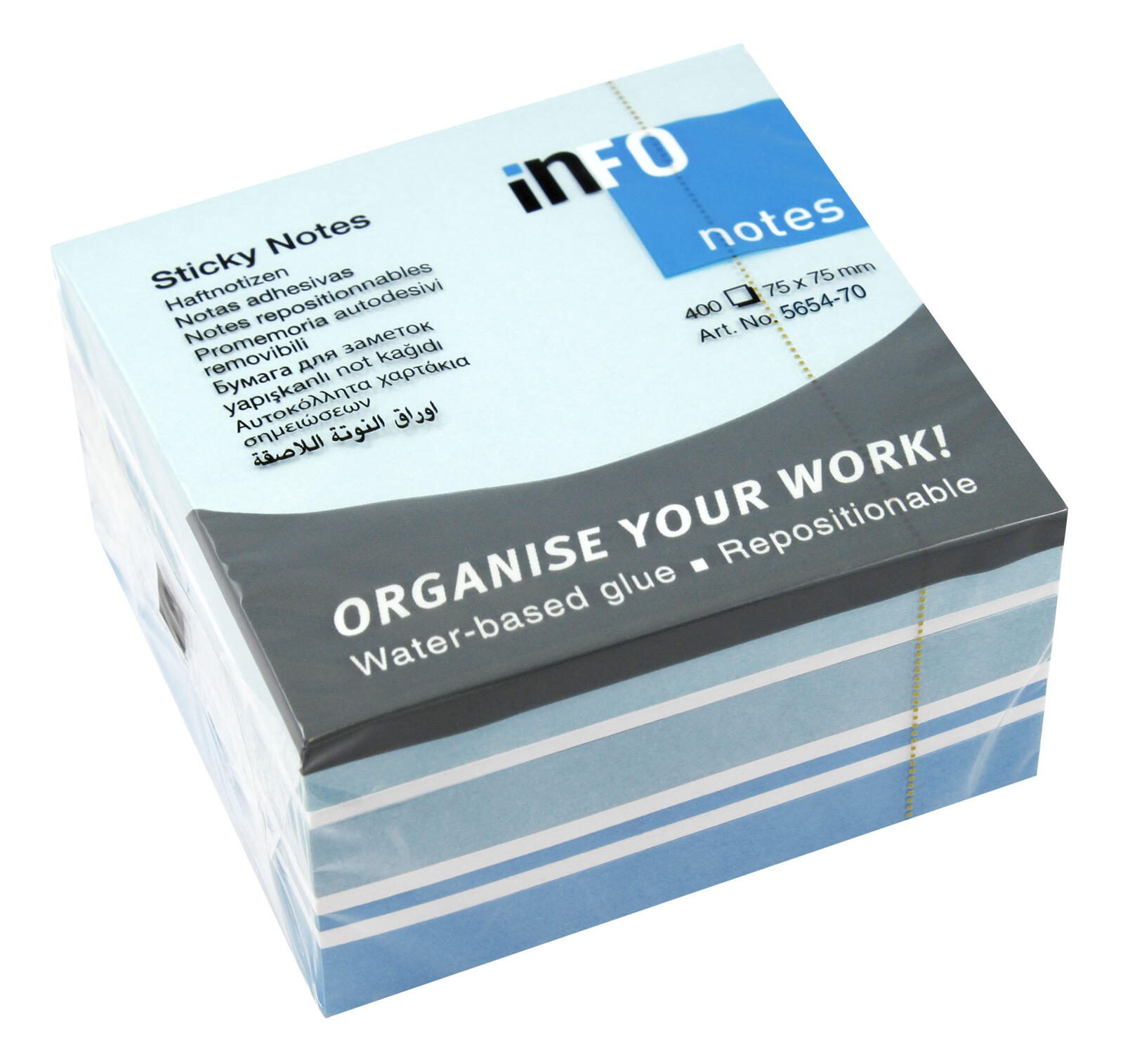Die inFO Haftnotizen sind die perfekte Lösung für alle, die ihre Gedanken, Ideen und wichtigen Erinnerungen schnell und unkompliziert festhalten möchten. Mit einer praktischen Größe von 7,5 x 7,5 cm bieten diese selbstklebenden Notizen genügend Platz für Notizen, während sie gleichzeitig handlich und leicht zu transportieren sind. Jeder Block enthält beeindruckende 400 Blatt, sodass du immer genügend Notizen zur Hand hast, egal ob im Büro, zu Hause oder unterwegs. Die farbsortierten Haftnotizen in hellblau und blau bringen nicht nur Farbe in deinen Alltag, sondern helfen dir auch, wichtige Informationen auf einen Blick zu unterscheiden und zu organisieren. Hergestellt aus hochwertigem Papier, bieten die inFO Haftnotizen eine ausgezeichnete Haftkraft, die sicherstellt, dass deine Notizen an Ort und Stelle bleiben, ohne zu verrutschen oder abzufallen. Die Blockausführung erleichtert das Abreißen der einzelnen Blätter, sodass du schnell und effizient arbeiten kannst. Die Verwendung dieser Haftnotizen trägt dazu bei, deine Produktivität zu steigern, indem sie dir ermöglichen, Gedanken und Ideen sofort festzuhalten. Egal, ob du sie für Meetings, zum Planen von Aufgaben oder einfach nur für persönliche Notizen nutzt, die inFO Haftnotizen sind ein unverzichtbarer Begleiter für jeden, der Wert auf Organisation und Effizienz legt. Mit den inFO Haftnotizen 7,5 x 7,5 cm bist du bestens ausgestattet, um deine Gedanken festzuhalten und deine To-Do-Listen zu verwalten. Entdecke die Vielseitigkeit und den praktischen Nutzen dieser Notizen und bringe Ordnung in deinen Alltag.Technische Daten