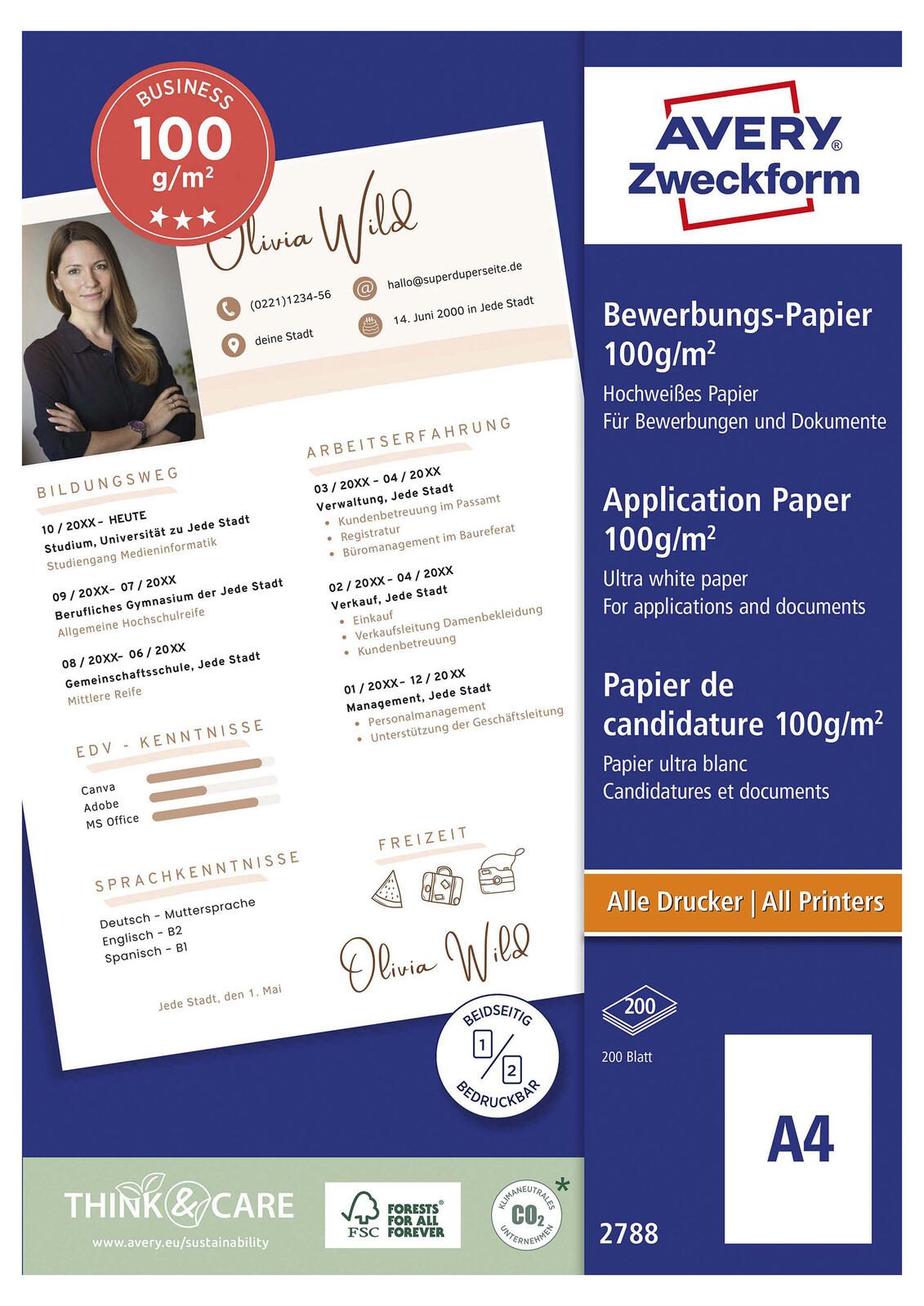 Das AVERY Zweckform InkJet Bewerbungspapier ist speziell für den Druck mit InkJet-Druckern konzipiert und garantiert hervorragende Druckergebnisse. Egal, ob du einen Kopierer oder Drucker verwendest, die Qualität bleibt stets hoch, sodass deine Dokumente in einem professionellen Licht erscheinen. Wenn du auf der Suche nach einem zuverlässigen und hochwertigen Papier für deine Bewerbungen und Präsentationen bist, wird dich dieses Produkt überzeugen.
