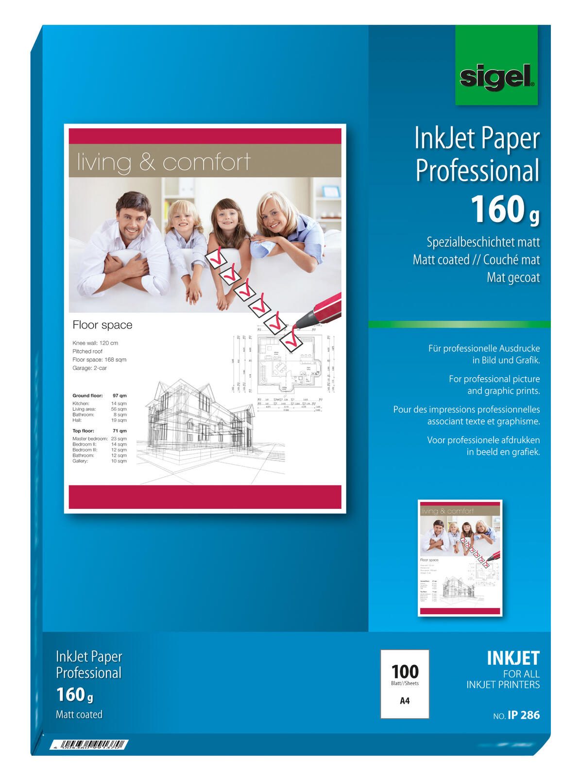 Das SIGEL Fotopapier Inkjet in DIN A4 Format überzeugt durch seine hochweiße Farbgebung und eine matte Oberfläche, die deinen Druckerzeugnissen eine edle und professionelle Note verleiht. Mit einem Gewicht von 160 g/m² bietet dieses Fotopapier eine ideale Stabilität, die sich besonders für hochwertige Präsentationsmaterialien, Bewerbungen, Angebote und Berichte eignet. Jedes Blatt ist einseitig beschichtet, wodurch du optimale Druckergebnisse erzielst, die sowohl in der Farbwiedergabe als auch in der Detailtreue überzeugen. Die hochweiße Farbe sorgt dafür, dass Farben lebendig und klar wirken, während die matte Oberfläche Blendungen minimiert und eine angenehme Haptik bietet. Dieses Papier ist speziell für Inkjet-Drucker und Kopierer konzipiert, was eine einfache Handhabung und hervorragende Druckqualität garantiert. Mit einer Packung, die 100 Blatt enthält, bist du bestens ausgestattet, um zahlreiche Projekte zu realisieren. Egal, ob du wichtige Dokumente drucken oder kreative Designs erstellen möchtest, das SIGEL Fotopapier ist die perfekte Wahl für all deine Druckbedürfnisse. Vertraue auf die Qualität von SIGEL und erlebe, wie deine Drucke durch die Verwendung dieses hochwertigen Papiers auf ein neues Level gehoben werden.Technische Daten