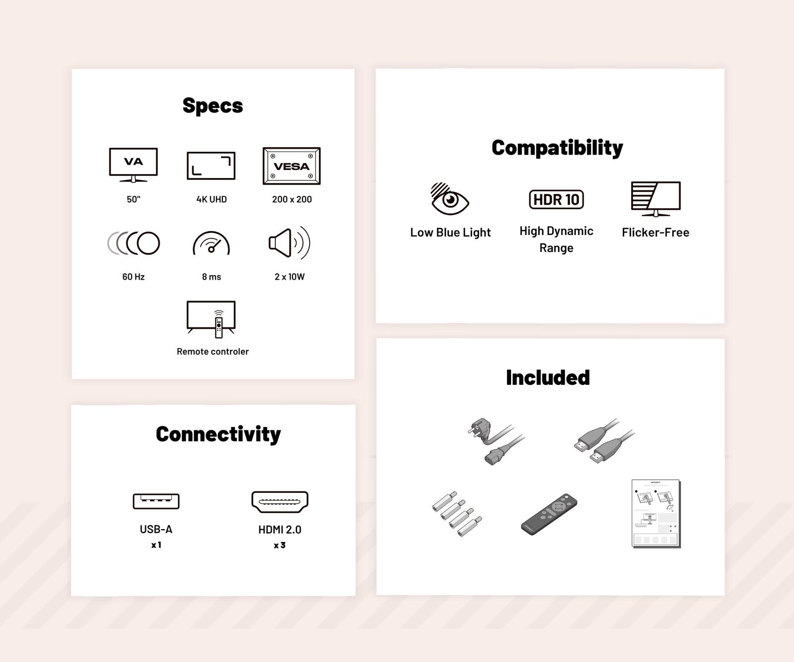 - Anschlüsse: 3x HDMI 2.0, 2x USB-A 2.0