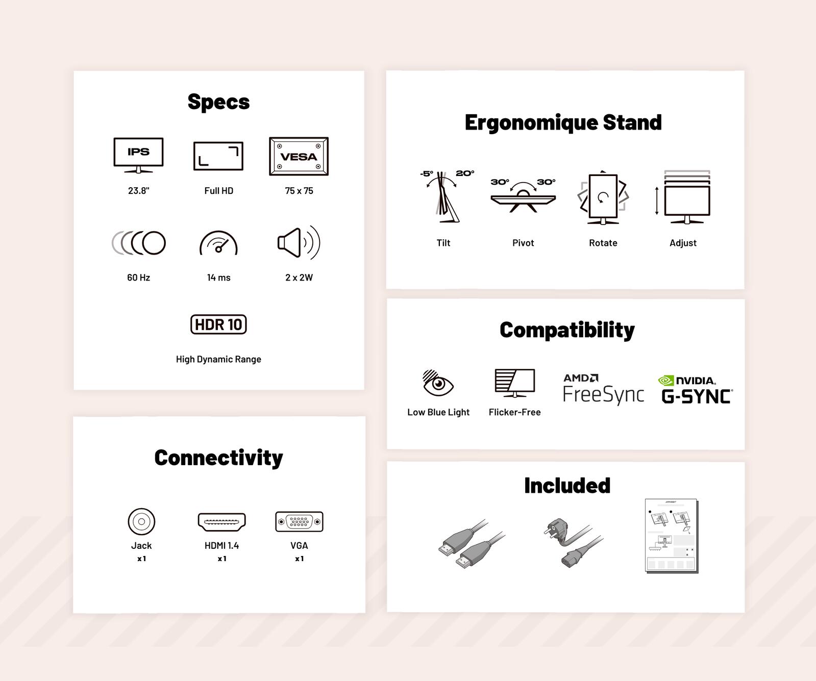 Befestigen Sie Ihren Bildschirm an einer Wandhalterung, einem verstellbaren Ständer, um Ihren Arbeitsplatz zu optimieren und Ihren Sehkomfort zu verbessern. Mit der VESA-Kompatibilität (75 x 75) können Sie eine ergonomische und effiziente Arbeitsumgebung schaffen, die Produktivität und Wohlbefinden fördert.
