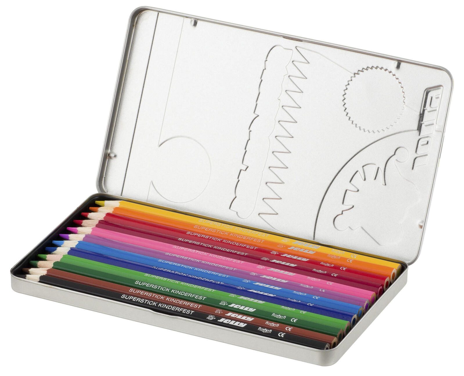 Die JOLLY Buntstifte Mehrfarbig sind die ideale Wahl für kreative Köpfe, die Wert auf Qualität und Vielfalt legen. Mit ihrer sechseckigen Form liegen sie angenehm in der Hand und ermöglichen ein präzises Zeichnen und Malen. Diese Buntstifte kommen in einem praktischen Metall-Etui und enthalten insgesamt 12 Stifte in einer breiten Palette von lebendigen Farben. Die Farbvielfalt umfasst hellgelb, orange, kirschrot, kaminrot, zyklamen, rosa, hellblau, dunkelblau, hellgrün, dunkelgrün, braun und schwarz. Diese Auswahl ermöglicht es dir, deiner Kreativität freien Lauf zu lassen und beeindruckende Kunstwerke zu schaffen. Egal, ob für Schulprojekte, Freizeitaktivitäten oder einfach zum Ausmalen, die JOLLY Buntstifte sind perfekt für jede Gelegenheit. Ein herausragendes Merkmal dieser Buntstifte ist die hohe Minenstabilität und Bruchfestigkeit. Dies bedeutet, dass du dir keine Sorgen um brüchige Minen machen musst, was dir ein ungestörtes Malvergnügen garantiert. Die Minen sind so konzipiert, dass sie auch bei intensivem Gebrauch lange halten und dir stets ein gleichmäßiges Farbergebnis liefern. Die JOLLY Buntstifte sind nicht nur funktional, sondern auch ein echtes Highlight in jedem Zeichen- und Malset. Ihre Qualität und die ansprechende Farbvielfalt machen sie zu einem unverzichtbaren Werkzeug für jeden Künstler, ob Anfänger oder Profi. Mit den JOLLY Buntstiften kannst du deiner Fantasie freien Lauf lassen und deine Ideen in lebendige Farben umsetzen.Technische Daten