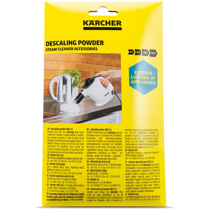 Der KÄRCHER RM 511 Entkalker ist ein speziell entwickeltes Reinigungsmittel, das zur Entfernung von Kalkablagerungen dient. Die Packung enthält sechs einzelne Entkalker-Einheiten, die sich ideal für den regelmäßigen Gebrauch eignen. Dieses Produkt ist besonders für die Pflege und Wartung von KÄRCHER Dampfreinigern konzipiert.